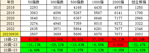 3:表格中的“20年底-23”栏进一步给出了这一轮牛市到顶端后进入熊市的表现,实际可以称为指数“回撤”考验。果不其然,国证2000指数依旧保持红盘正收益。紧随其后的是中证1000和500指数。结合上一栏就等于考核给评语了。牛市能上涨熊市能抗跌的就是这几个中小盘指数。创业板指则体现了涨过头跌也过分的过山车特点。