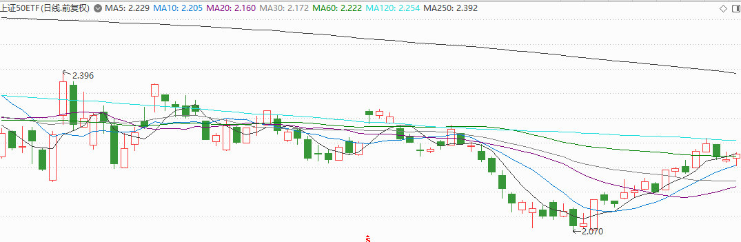 这就是2018年Q4的50ETFK线图。图片开端就是政策底启动的两根长阳,随后也一样没能持续上涨突破,而是持续调整并且在12月做为最后的崩盘板块创了新低(也就是上证指数2441点)。现在人们总结为政策底+XX时段间隔=市场底就是这样看图说话得来的。