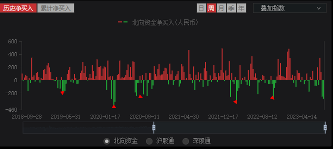 这就是从2018年9月到2023年8月的以周为单位的北水资金柱状图。