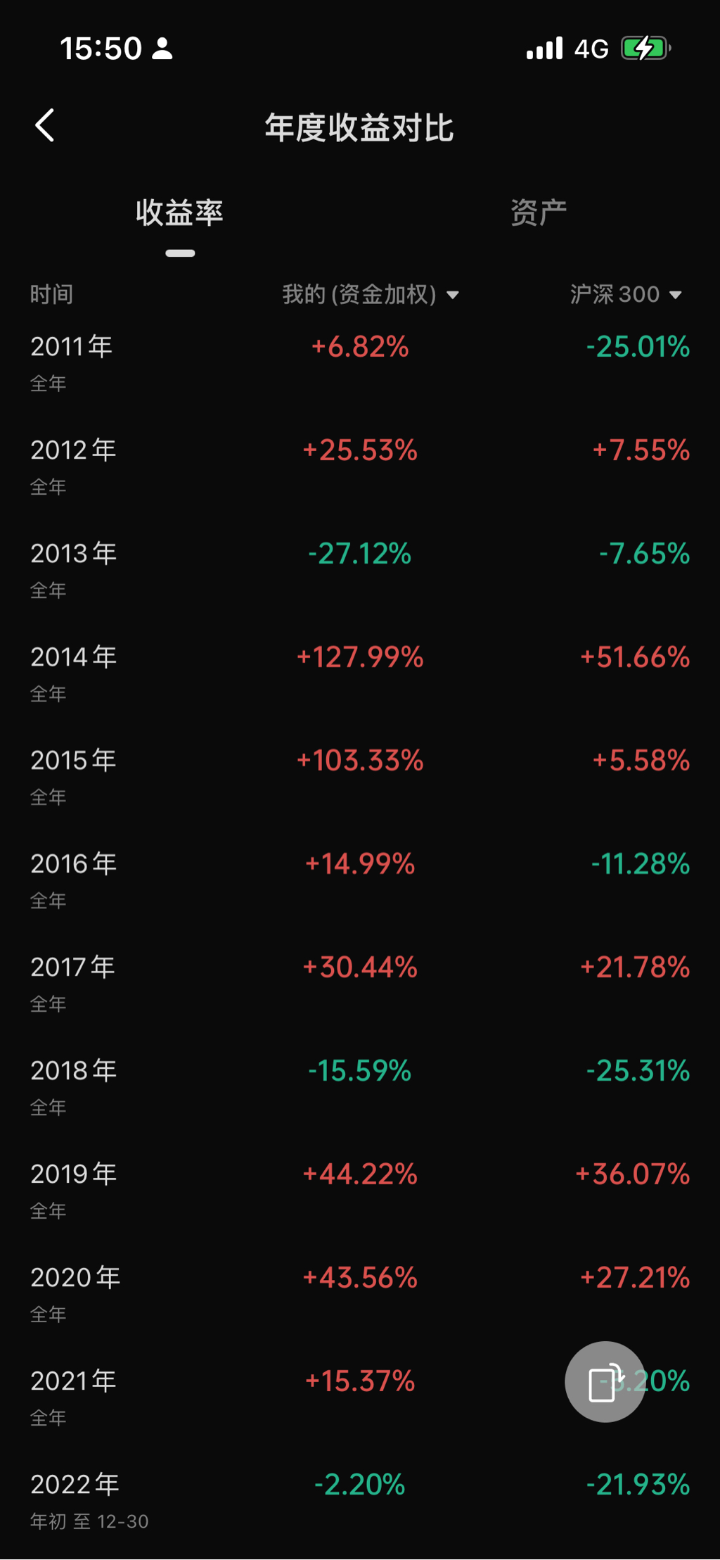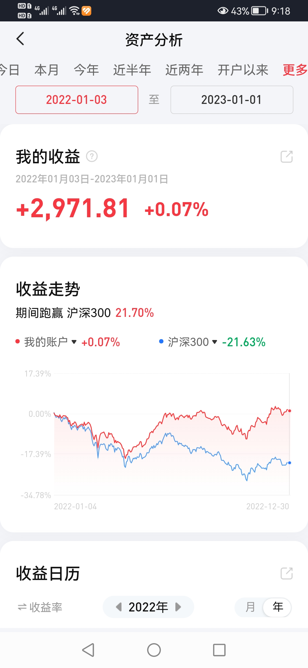 4.3%,22年是炒股最轻松的一年。,券商搞了个大规模实盘赛,我所在组收益前100名有55%是正收益,前100名指的是这2年多综合收益。我这个位数的收益要按年收益率排到1000名以后了。第一名综合收益最高收益是300%多。前两年还有奋起直追的勇气和精神,如今不知怎么了,只想躺平。最高的时候我排到第20名。年未退到了40+,很想挤进前十。不过要付出很大的精力和心血。想想都觉得累,早晨的被窝不暖吗?游戏不好玩儿吗?视频不好看吗?一方面想继续努力一方面不想活的那么辛苦,什么时候才能练成轻松就能赢大利的境界就真的悟道了