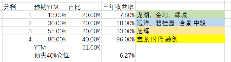 各个主体的情况没有什么大的变化,20旭辉01出了方案,首付2块、展期19个月,利率从3.8%提高到4%。市场普遍认为会二展或重组,如果按2103在30左右的价格,如果半年付息、3年还本,YTM在50%多。据说融信也要出方案了,个人有2万的小额,对融信抱的期望不大。去年跟朋友聊地产垃圾债的三个底,政策底、情绪底目前已实现了,还在场内的投资人大概都在等第三个市场底出来。是不是过于乐观了我也不知道,投资总归是需要一点运气的。