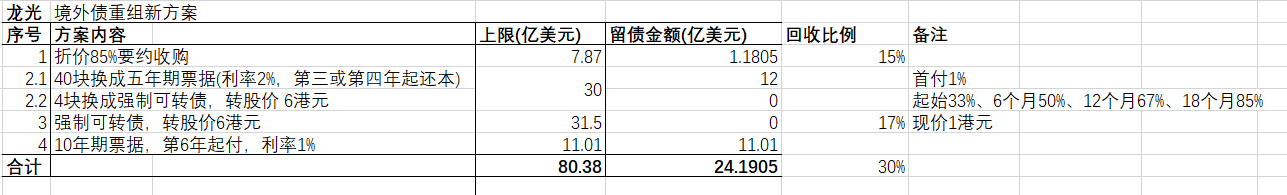 留债10年的就不用想了,鬼知道后面会不会继续展期;特定资产收益权看上去35%的回收率,但底层能收回多少还不一定,打个5折也不一定;转股目前市场价HKD 2.6,考虑到后续大环境和冲击成本,按现价回收率30%砍一半也就是15%。所以看上去综合回收率大概15%左右,跟之前市场的传言相契合,低于停牌前大概18左右的二级市场成交价,所有人基本都亏肿了吧。