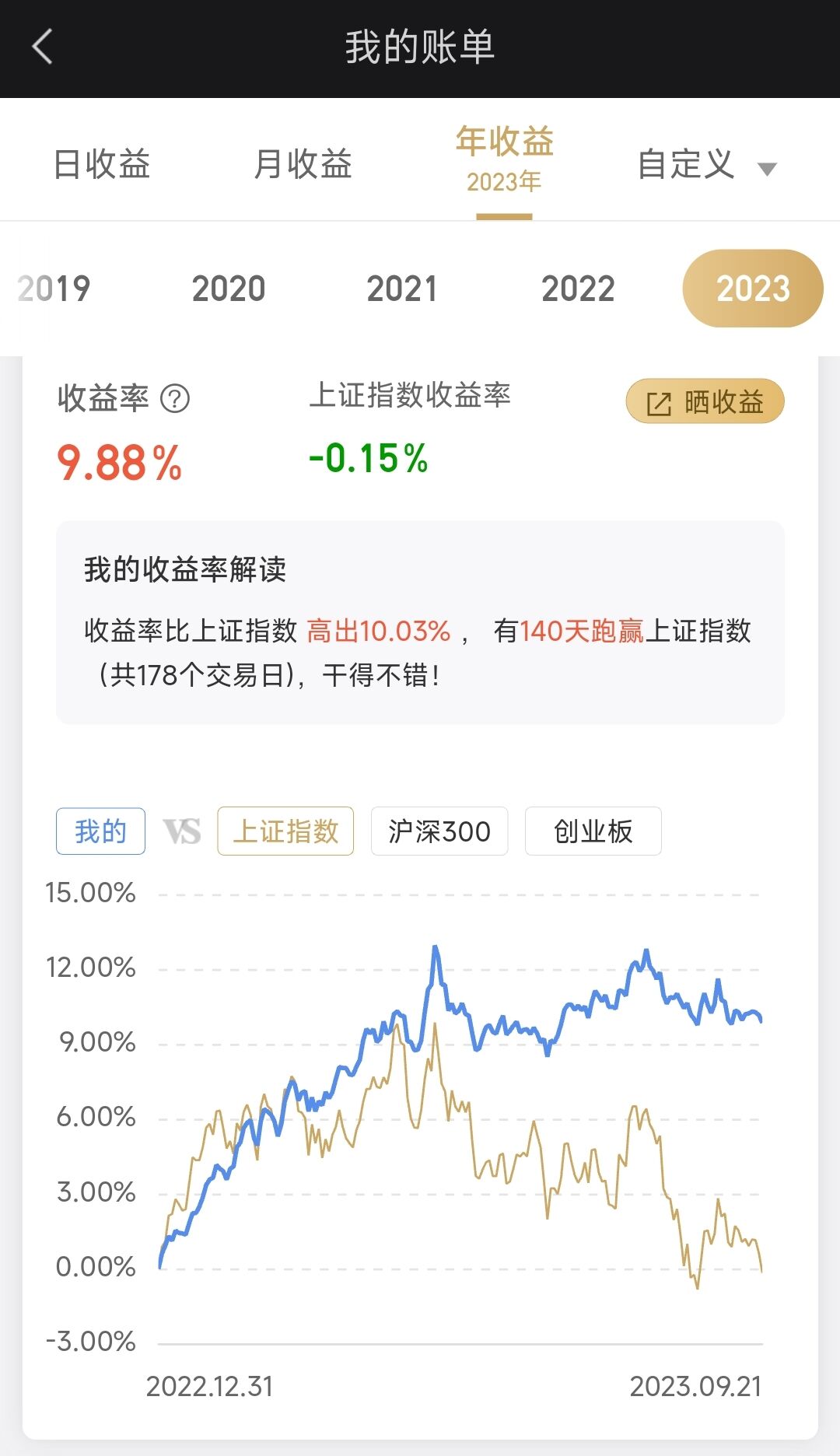 回顾一下2023年自己投资波动,上半年5红1绿,下半年2红4绿,整体体验感还不错,收益率10.74%。