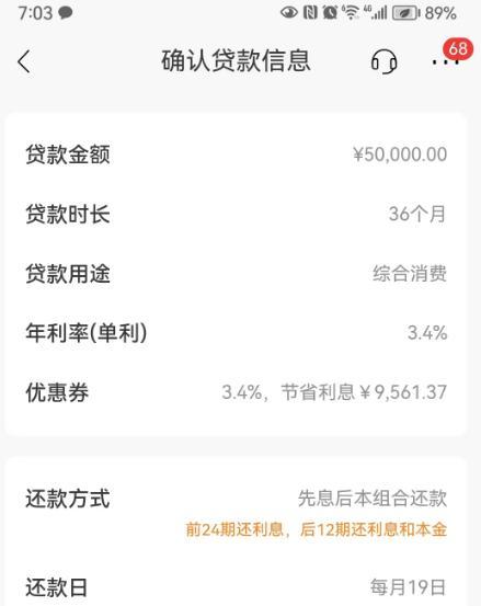 闪电贷给的额度:5W已贷出,36个月 前24个月先息后本,最后12个月等额本息。