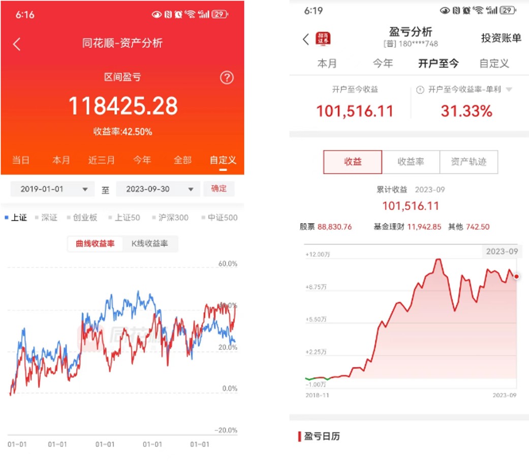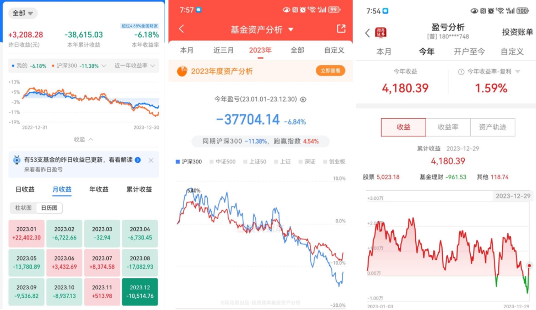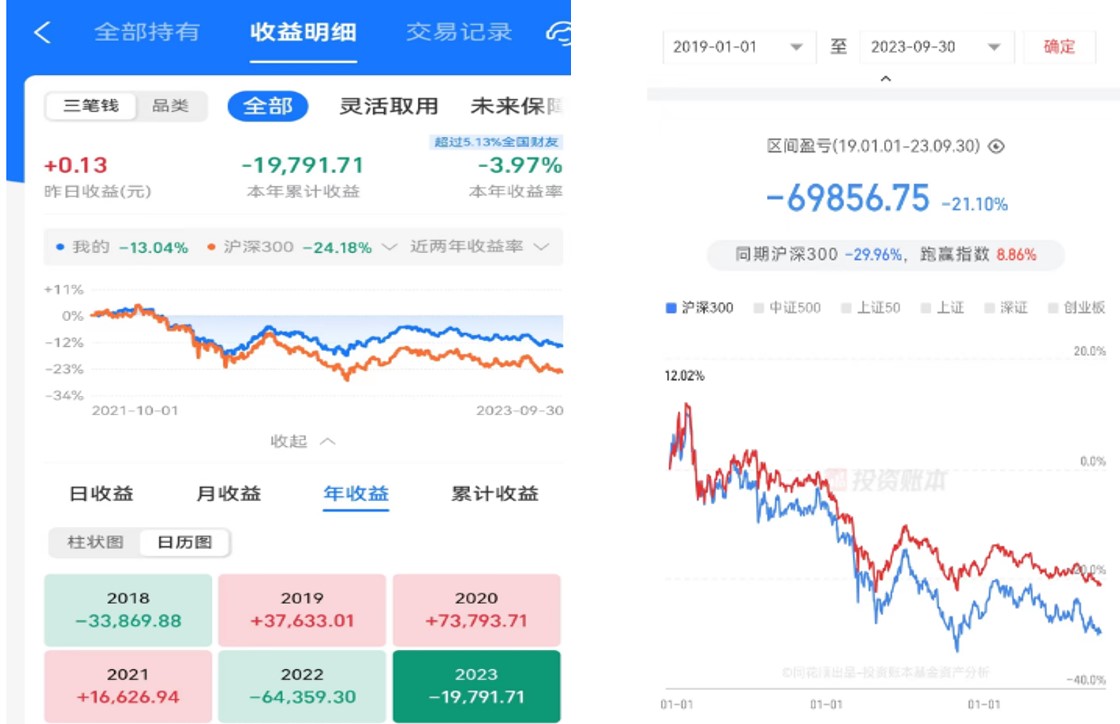 左一是支付宝账号,累计收益最高9万,目前已变成负数-3600元;