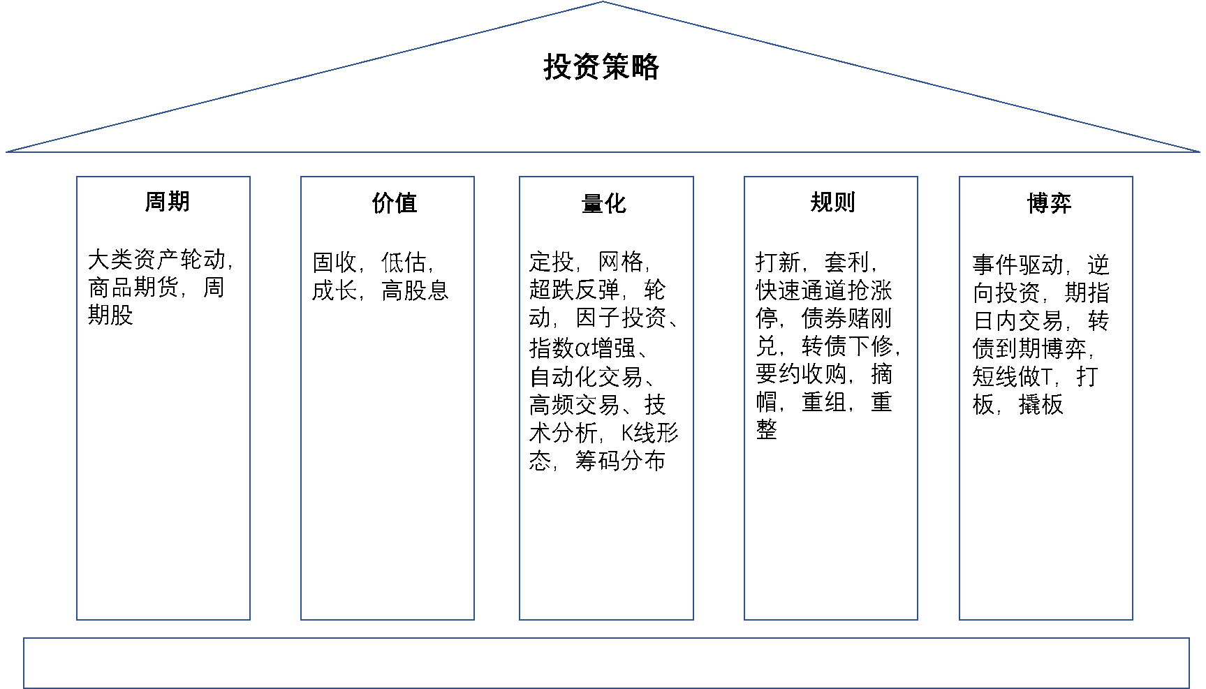 每个人都有自己的投资策略或者挣钱方法,市场上可能有几千种策略。按照周期、价值、量化(统计)、规则、博弈等五个维度,我们将知道的或听说过的投资策略进行汇总,如见图5-1所示。****