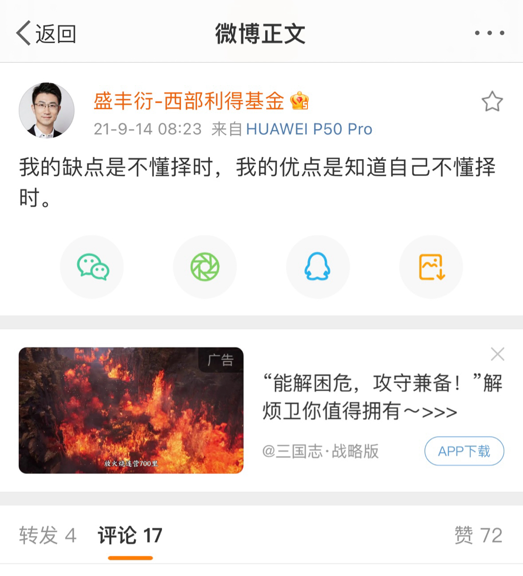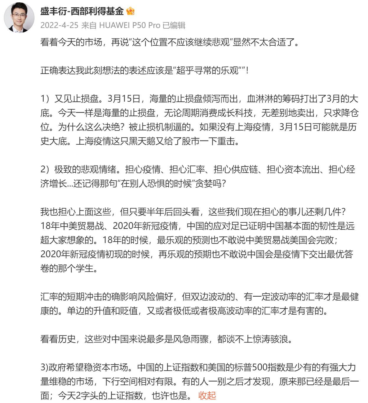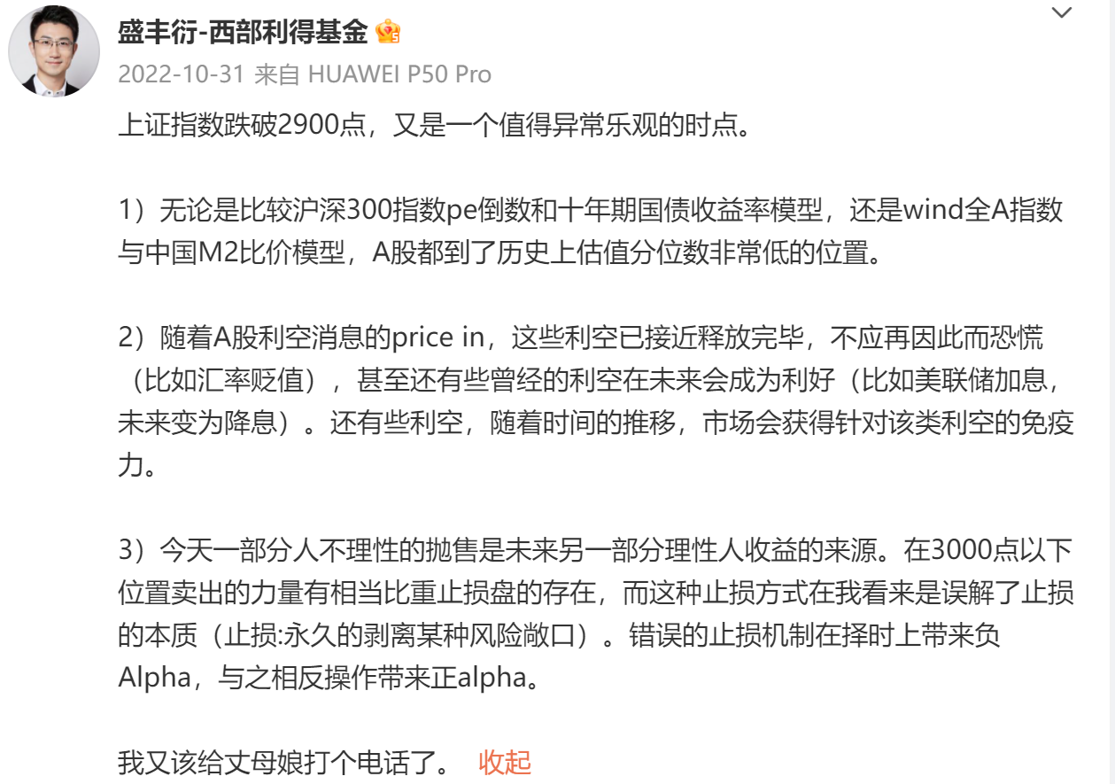 盛丰衍的置顶微博,之前是22年4月25号和10月31号发的两条,看收盘价的话,