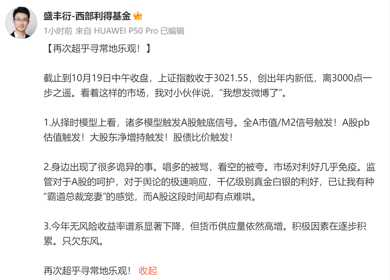 2023年10月19日 盛丰衍再次异常乐观盛丰衍的置顶微博,之前是22年4月25号和10月31号发的两条,看收盘价的话, 4月25那次,还需要忍耐1天。 10月31日那次,1天都不需要忍。今天盛总再次异常乐观了,看看这次是不是能和去年一样,几乎精准到天。 最近流出的主力,能看得见的,是外资。和以往不同,每天似乎都有几十亿的外资在不管不顾的卖,体现在每天的北向流出上,出了利好,或者美债收益下跌,...有没有可能只有蒙对的帖子才会置顶
