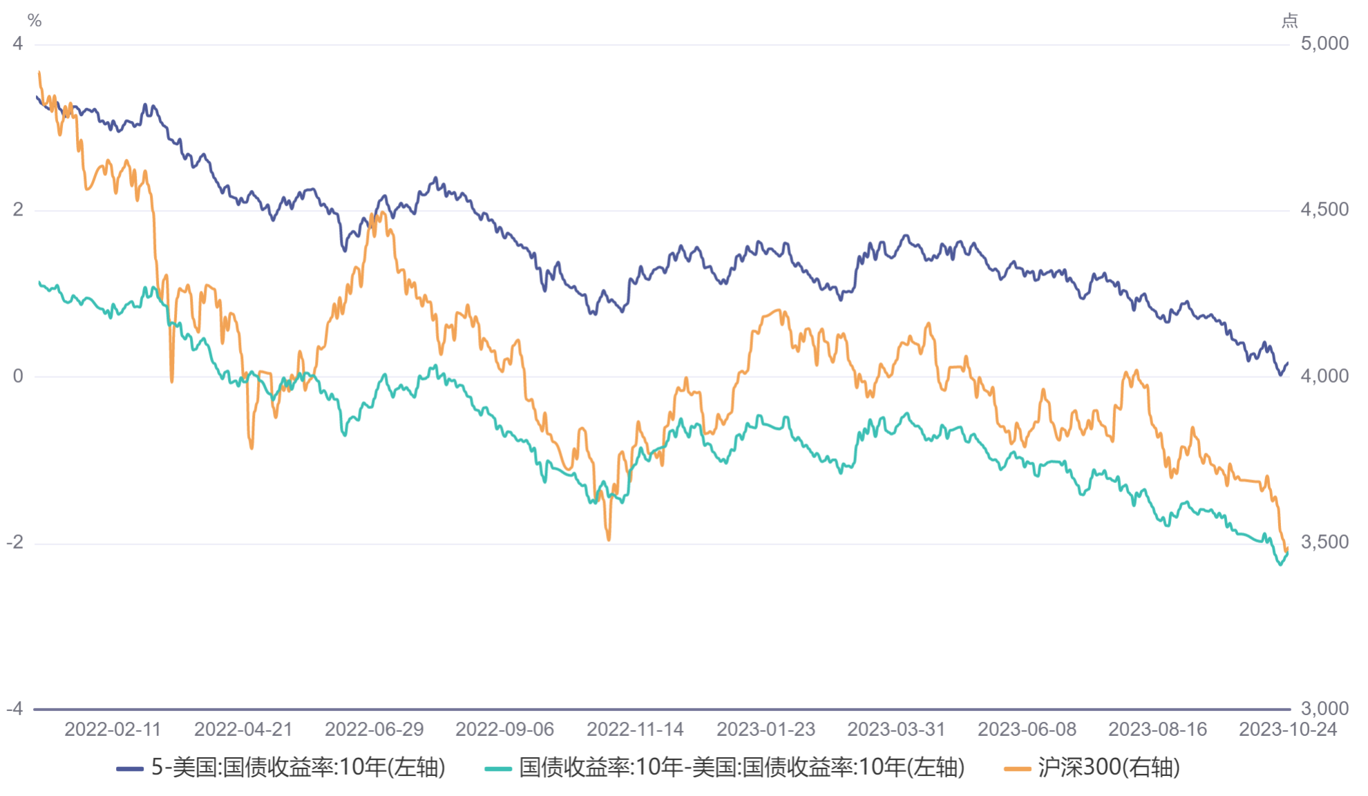 最后上一张沪深300和美债收益、中美国债收益差的图。