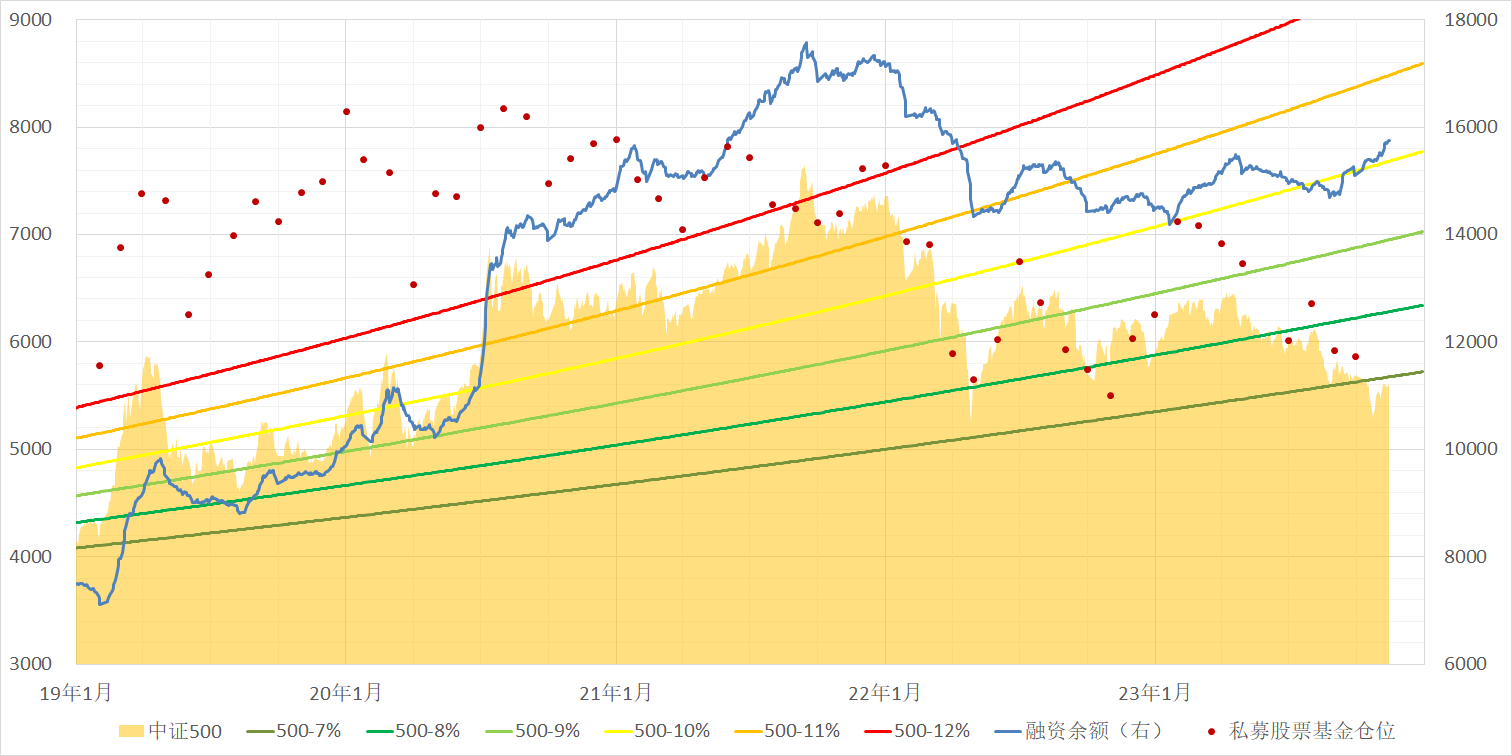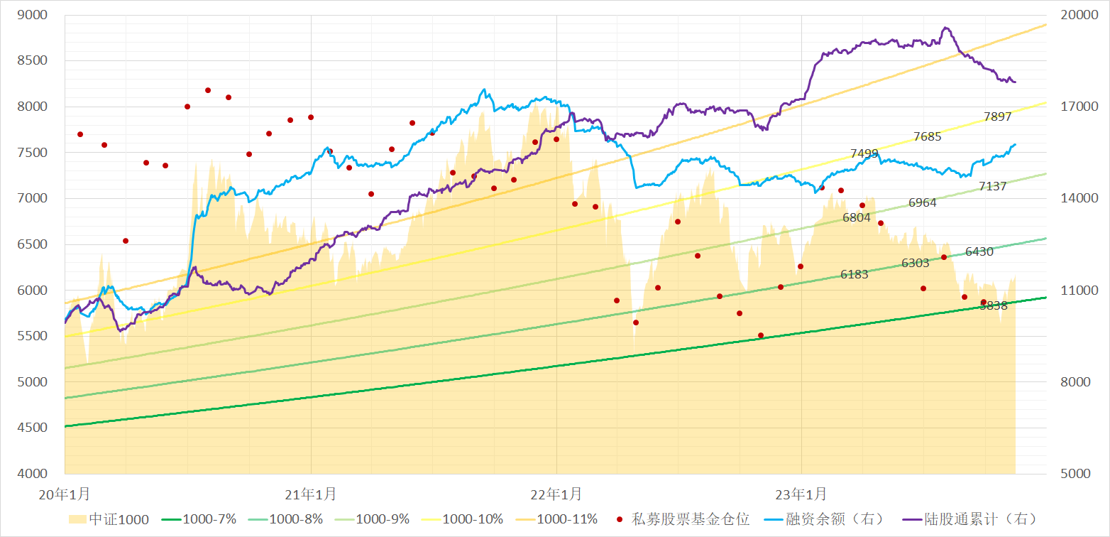 中证1000这波在6000点已下呆了四天,介于2022年4月和10月两个底之间,目前又回到7%增速线之上。