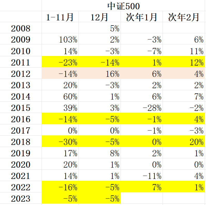 以中证500为例,有一个统计上非常好用的月度涨幅。
