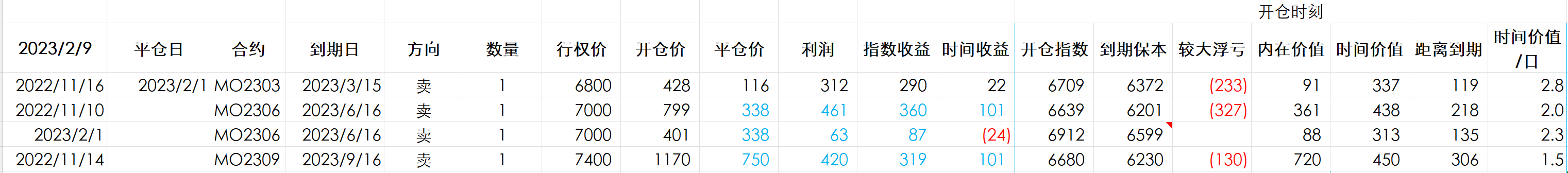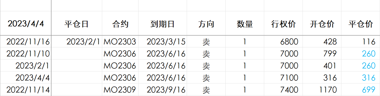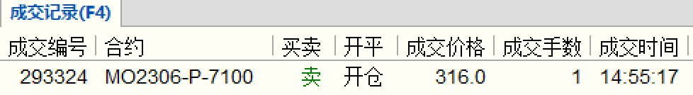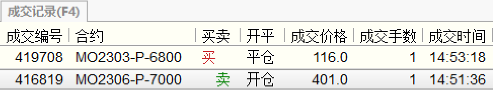 今天换仓1手MO2303-P-6800到MO2306-P-7000,