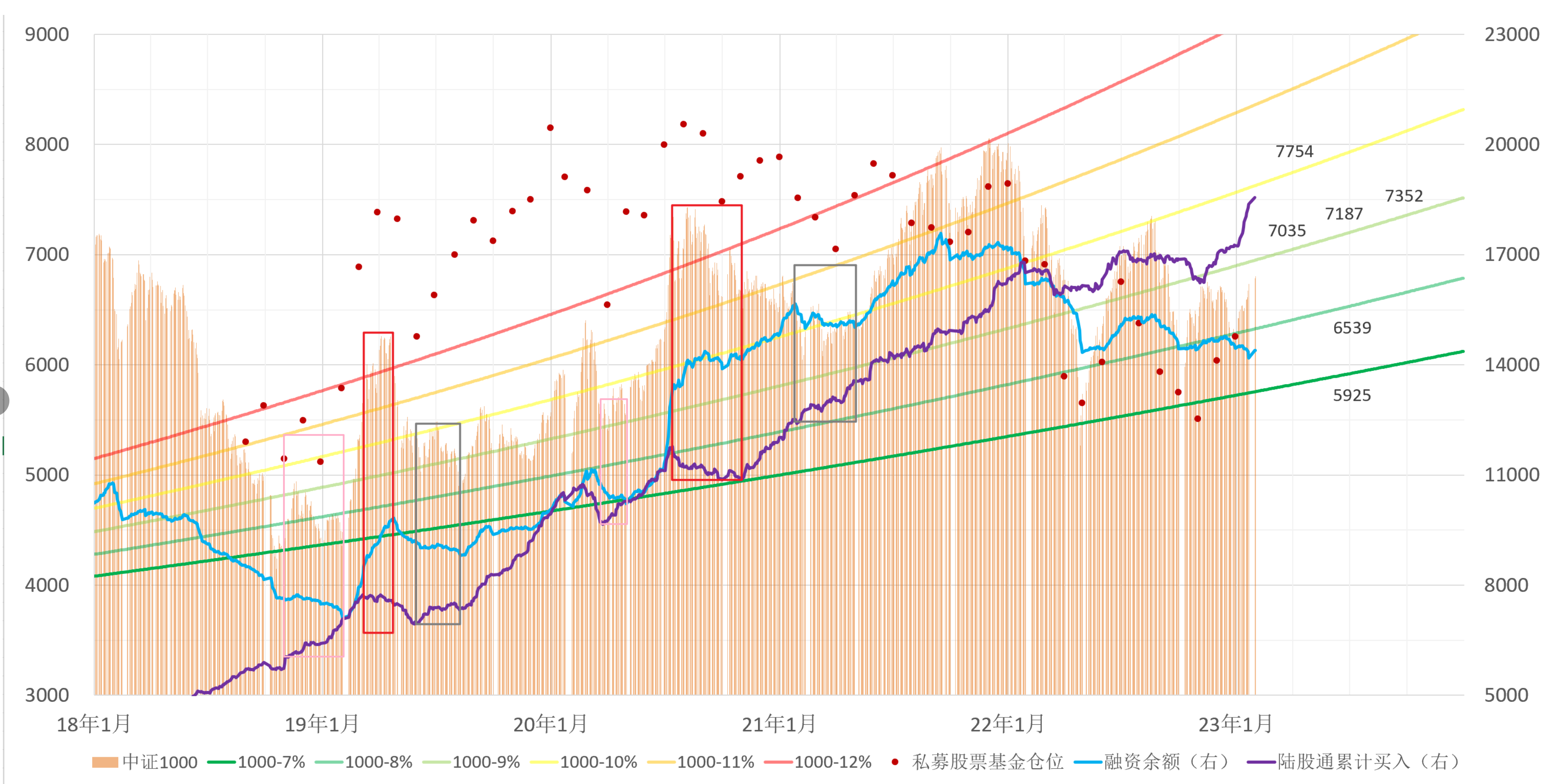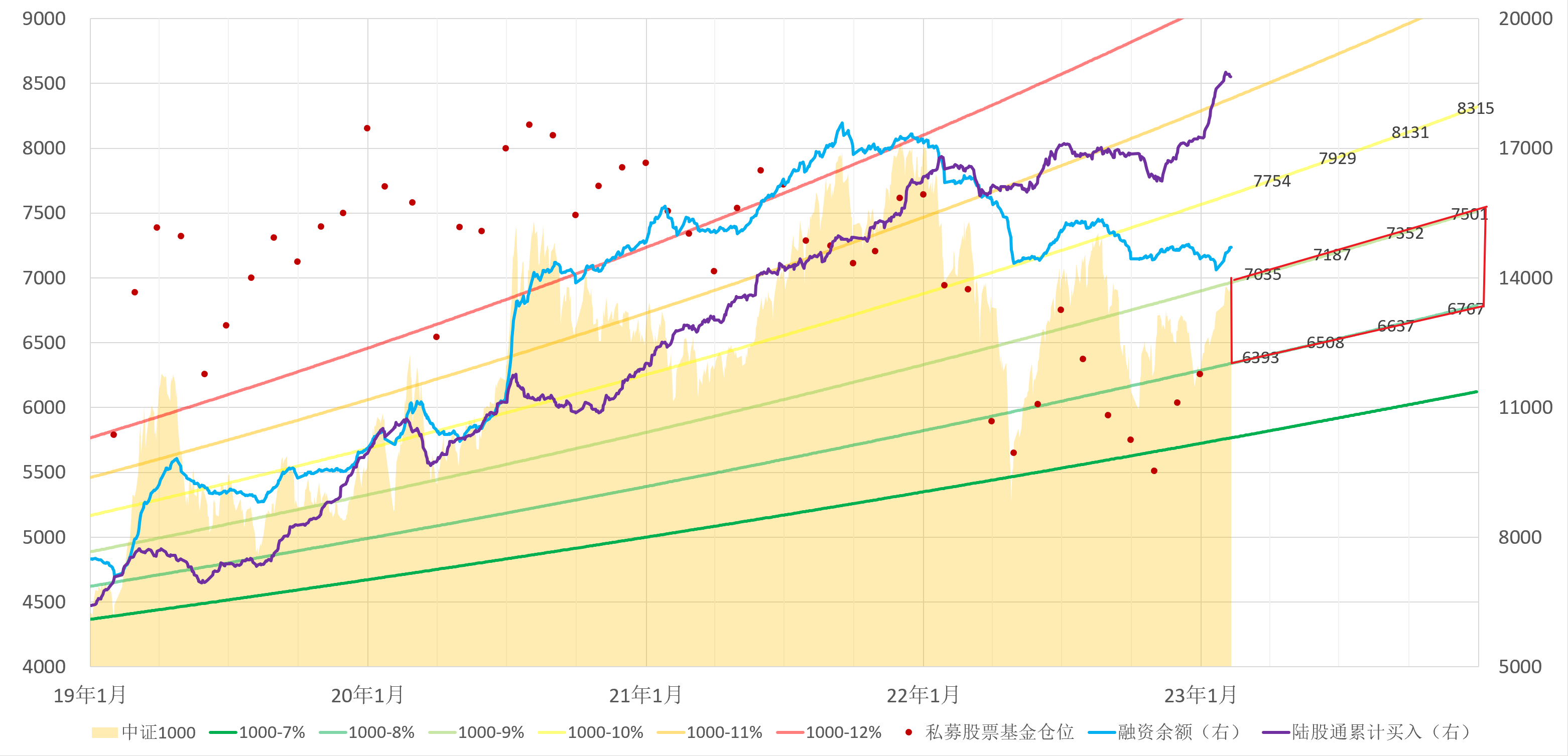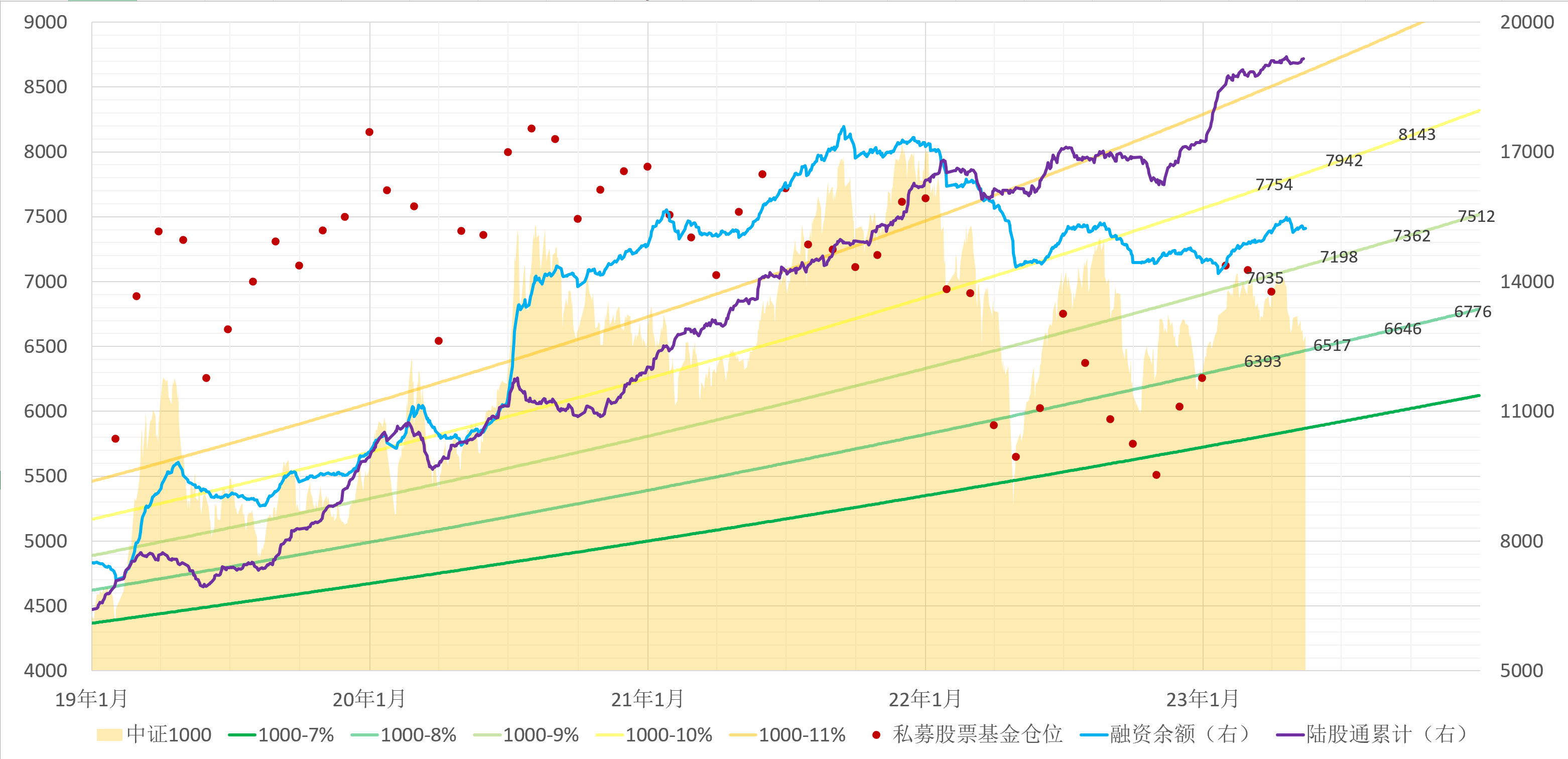 中证1000去年年底是个悲观的低点,当时大家都阳着在家里,这个点位刚好落在8%增速线附近。