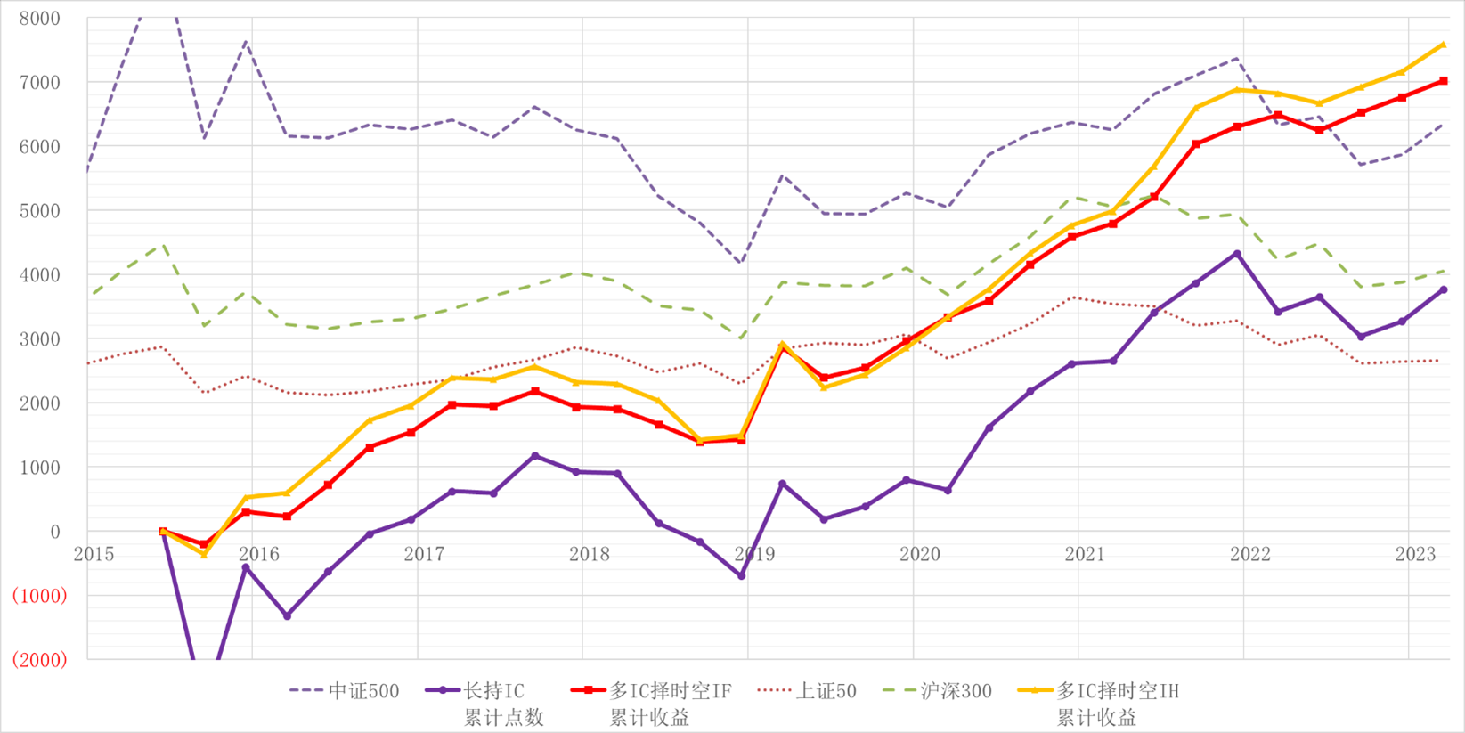 其次择时策略里面收益最高的多IC择时空IF/IH,肯定要加进去,牛市基本同步,熊市避开大半;