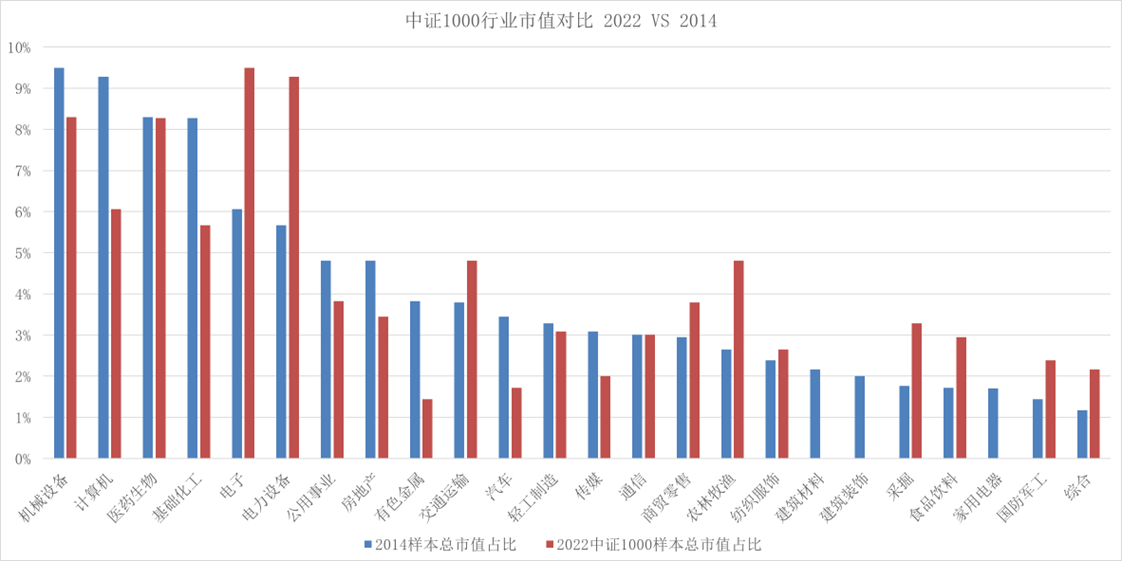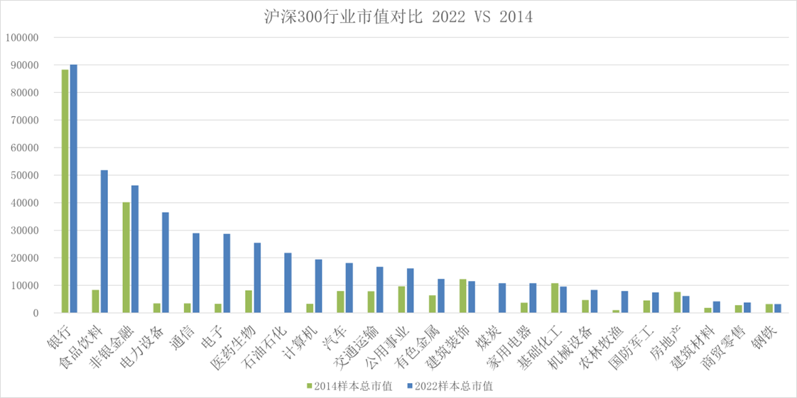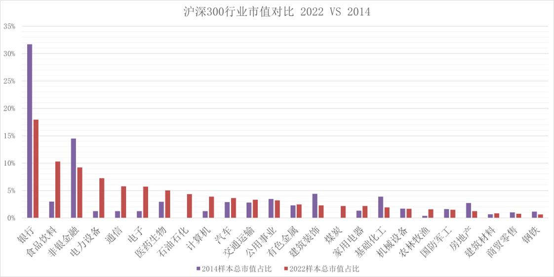 先看一下沪深300 2014年和2022年的行业市值对比,很快就能发现这玩意为什么不行了。