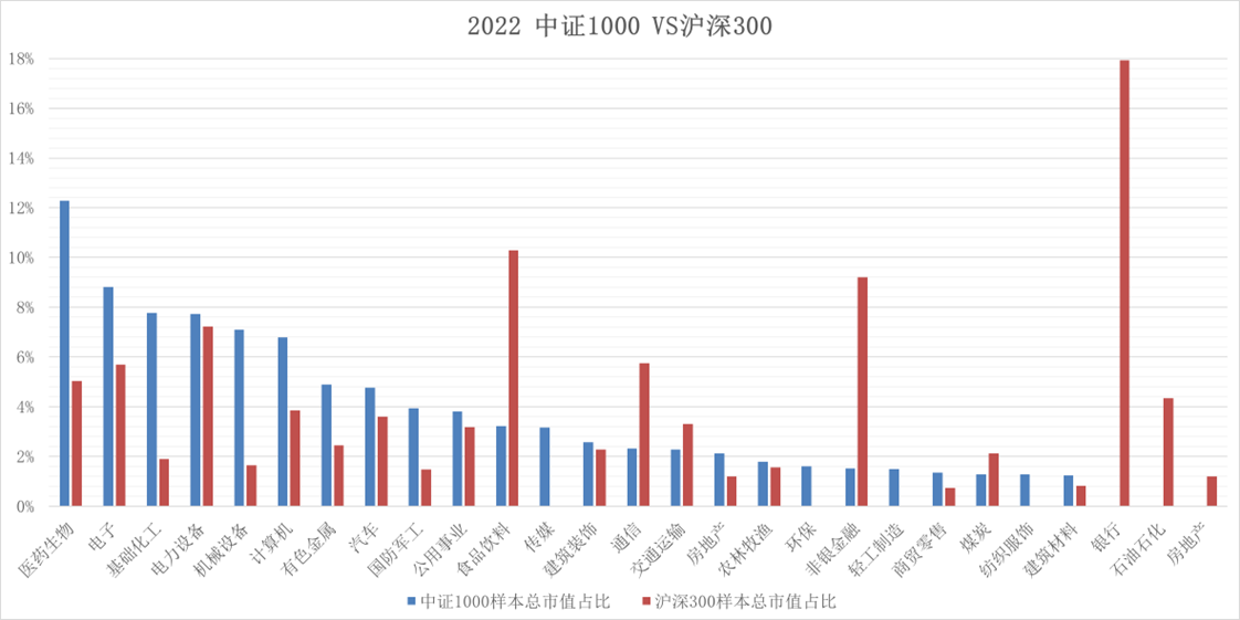 中证1000和沪深300的行业分布既然有了多IM空IF的对冲组合,那么细化一下,把行业分布对比一下,肯定是必要的,毕竟这两个东西不是只有大票小票的区别。