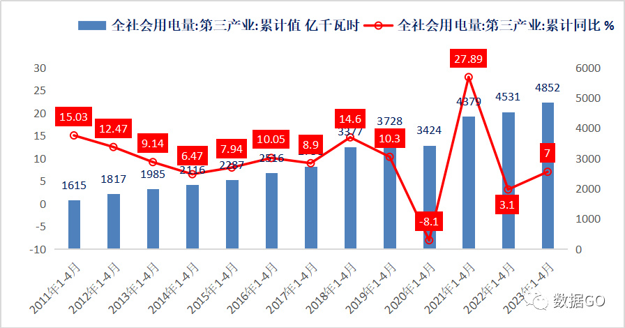 翻出了二产和三产用电量的数据,和2019年比,分别增长了25%和34%,