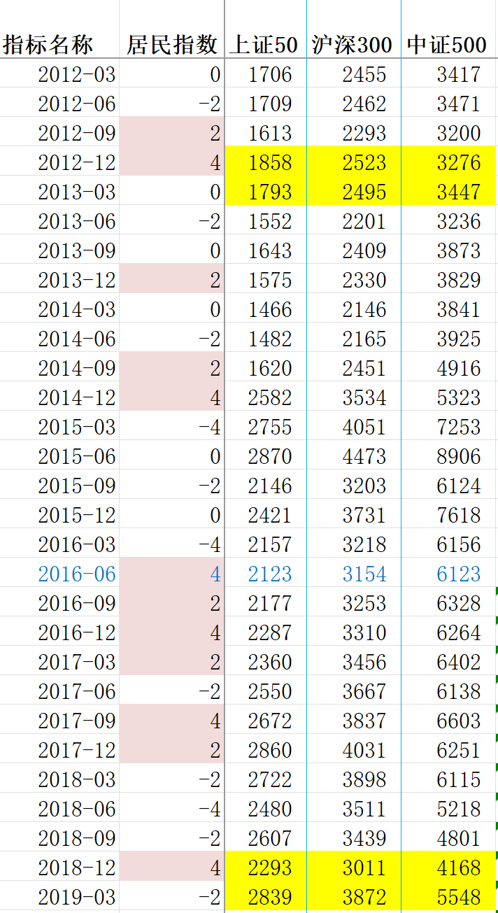 我把你的居民指数在-4或者正4两栏独立出来,并且以股灾之后的2016年开始对照实际指数表现,看到这样一个结果:
