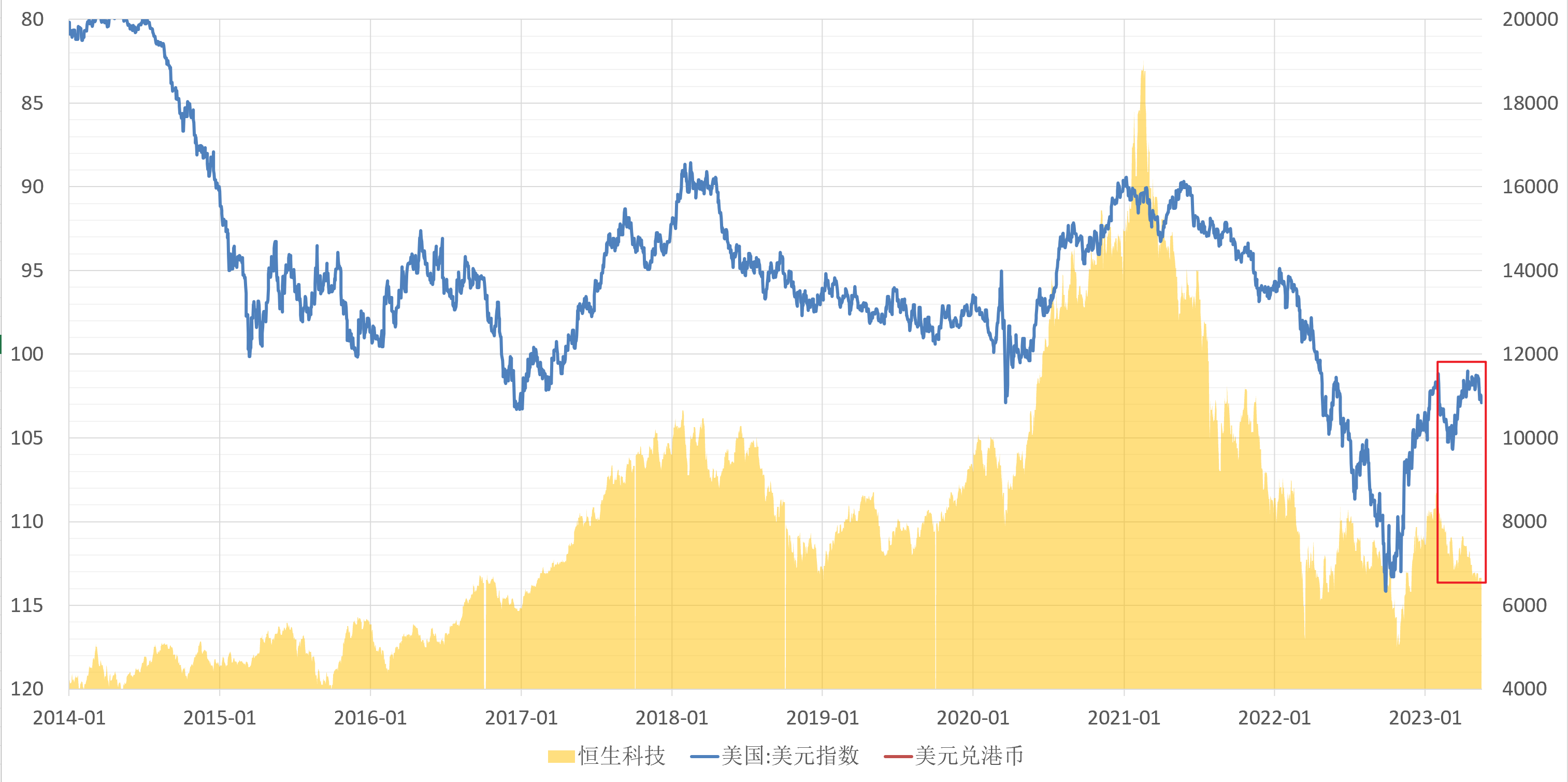 但最近美元没涨,恒生科技却从4800点跌至3800点,负相关性消失了。