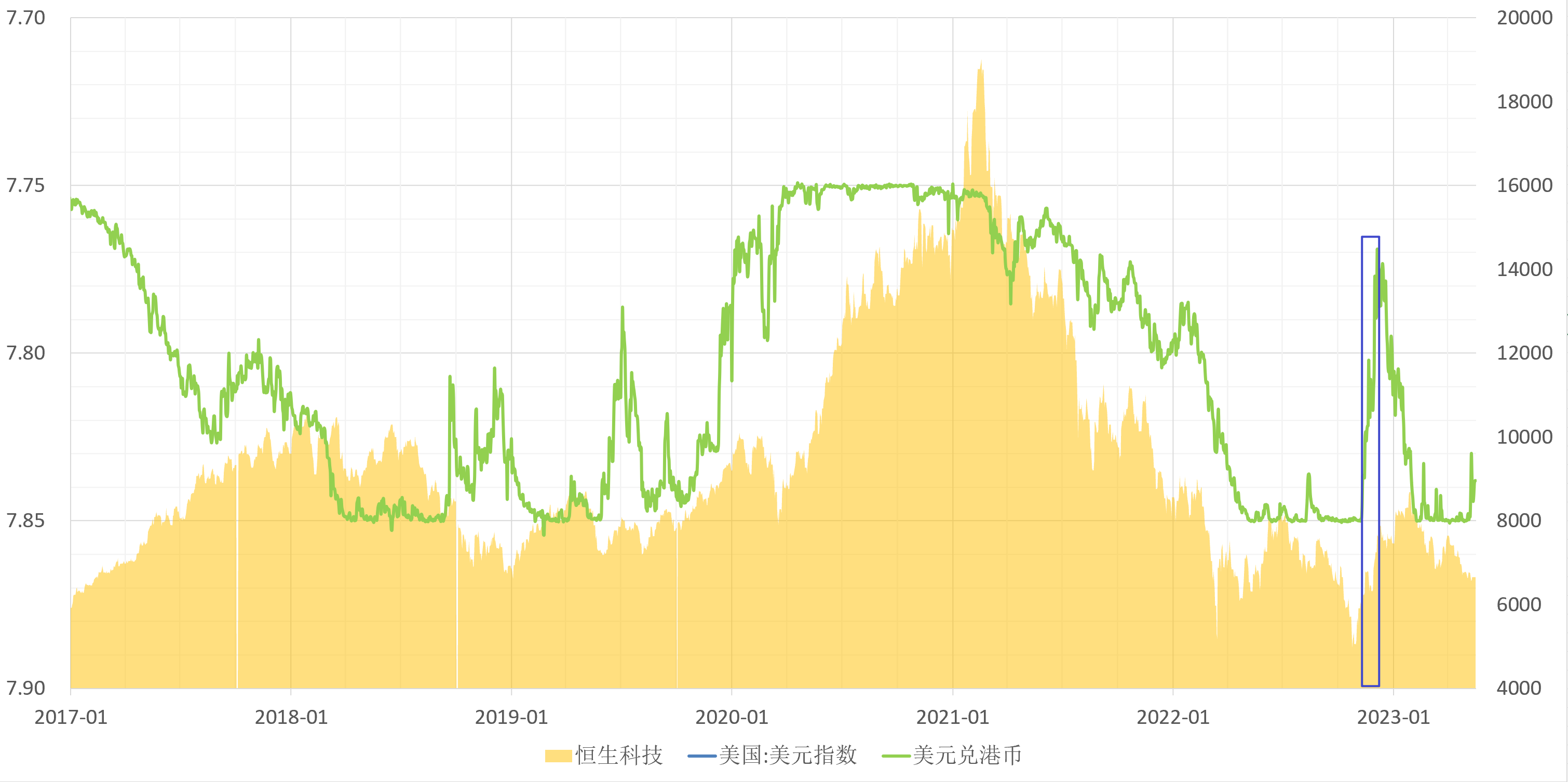 近期恒生科技回落至前期低点附近,表现低迷,但港币汇率有点脱离弱方保证的迹象。