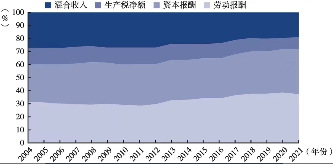 初次分配格局:2021年,劳动报酬份额为37.7%,较2020年下降了1.1个百分点;资本报酬份额为34.3%,较2020年上升了1.1个百分点;公共要素报酬份额为9.3%,较2020年上升了0.6个百分点;混合收入占比为18.7%,较2020年下降了0.7个百分点。