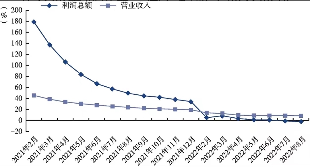 工业方面:2021年2月初至2022年8月工业企业营业收入和利润总额累计增速,增收不增利。