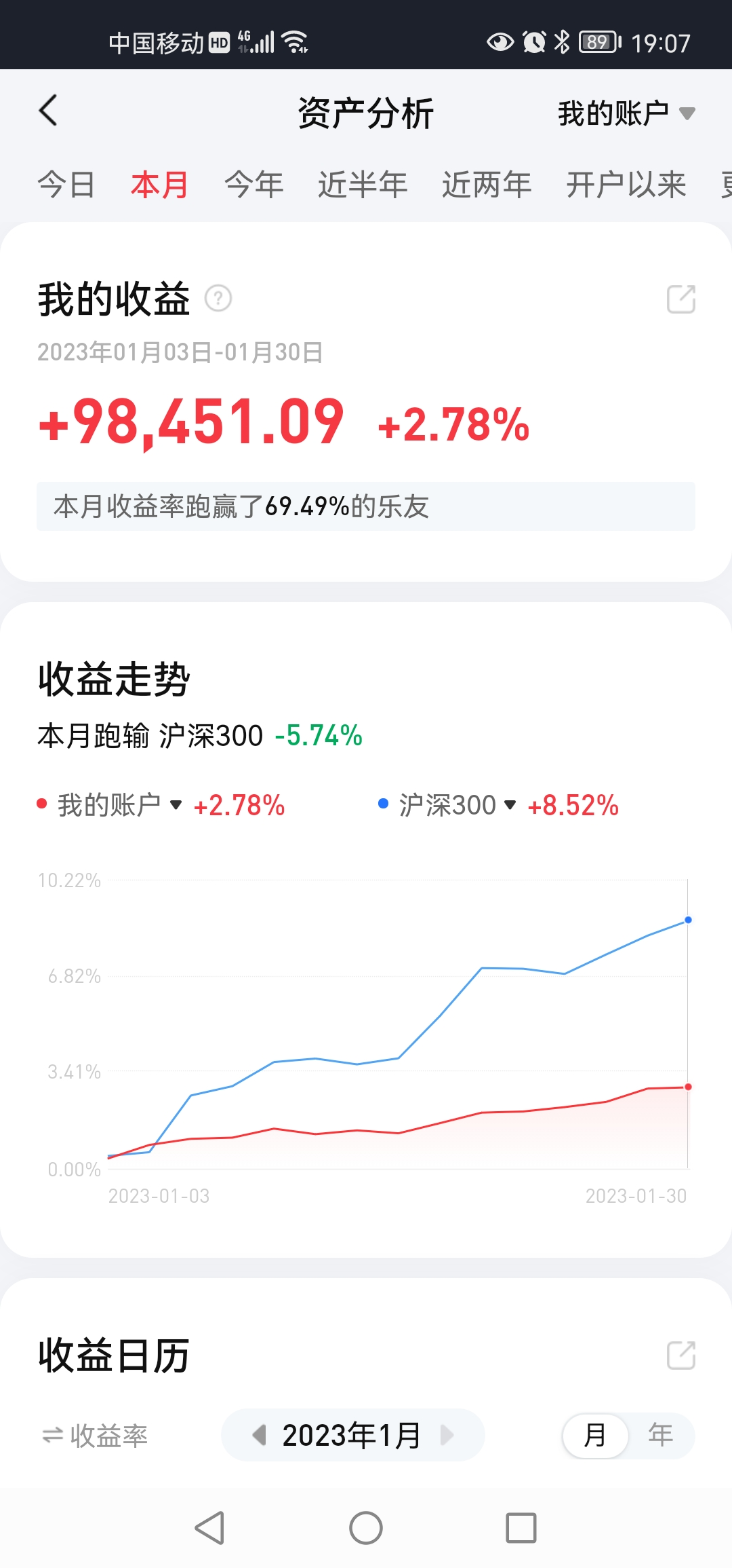 2023年1月投资小结本月收盘净值1.046比年初上升 0.046,取得了今年的开门红。恭喜恭喜,看哪天我也去抱个大的金元宝^_^
