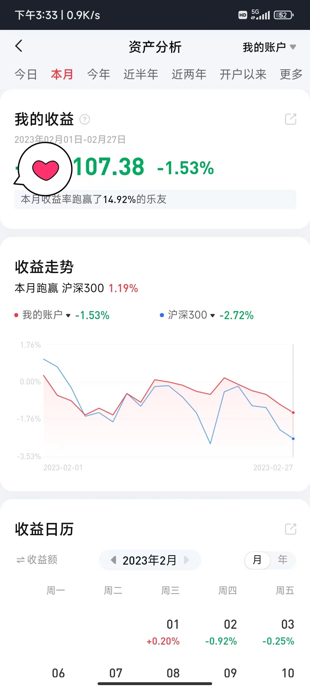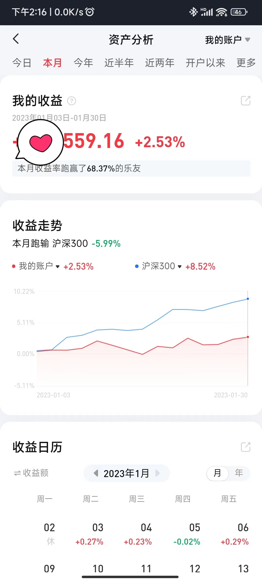 2023年1月投资小结本月收盘净值1.046比年初上升 0.046,取得了今年的开门红。孔大是我步入低风险投资的带路人,恭祝孔大新春快乐,市值频创新高~
