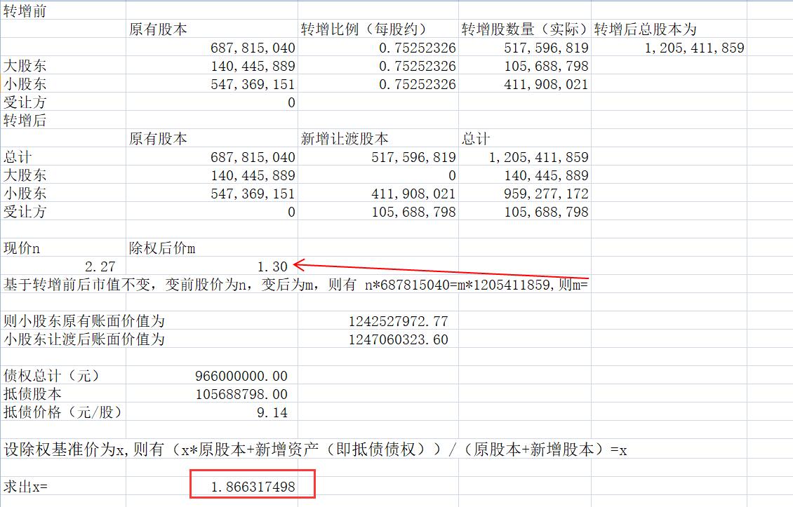 仔细计算了一下凯撒的方案,用投资+赖掉的债务去推算,感觉抵债价格13块,还是有点黑心了。想请教一下G大老师,通过抵债价格去推算除权基准价格是怎么样的过程。