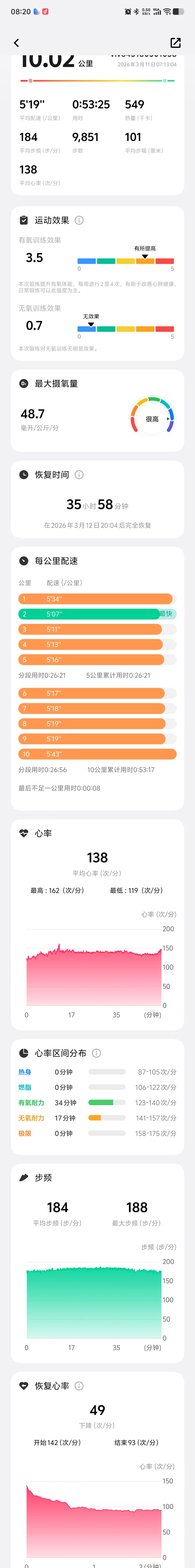 但是其实个人感觉,前五公里是轻松的,后五公里是要逼自己坚持的——这应该是乳酸阈值跑了