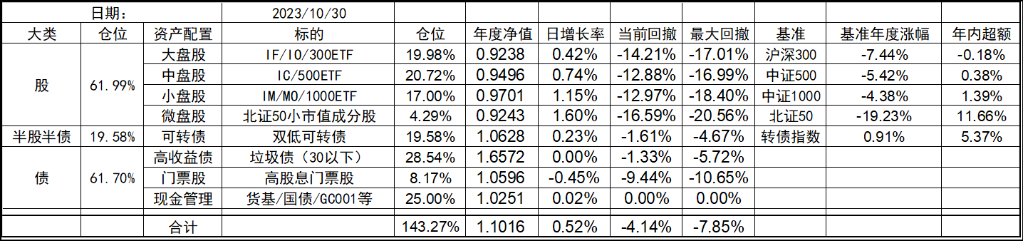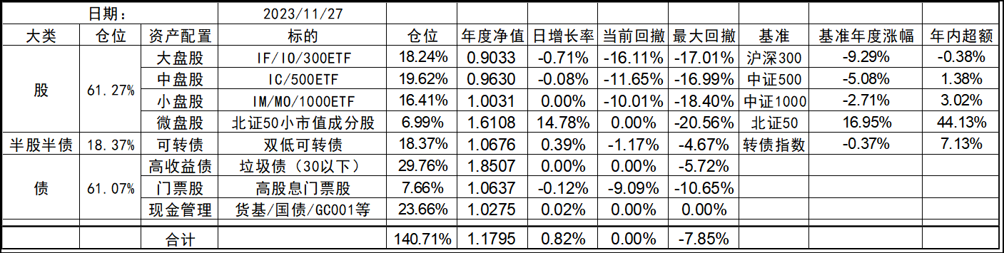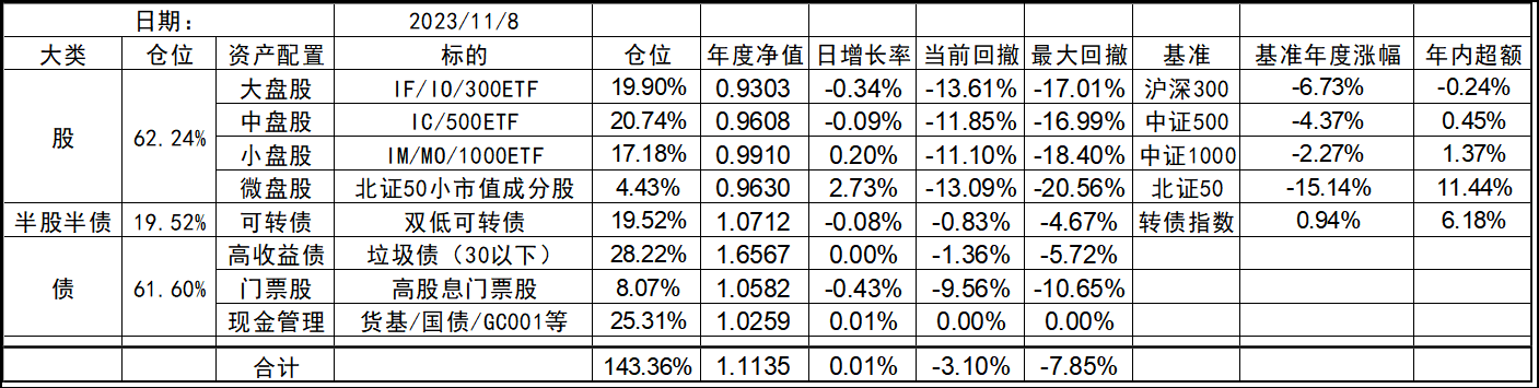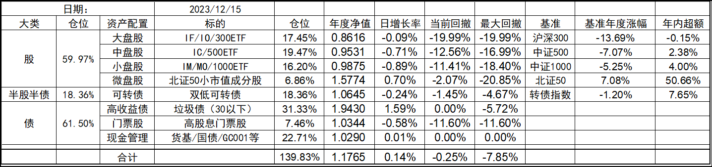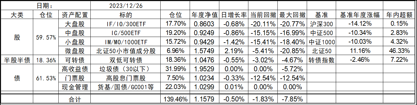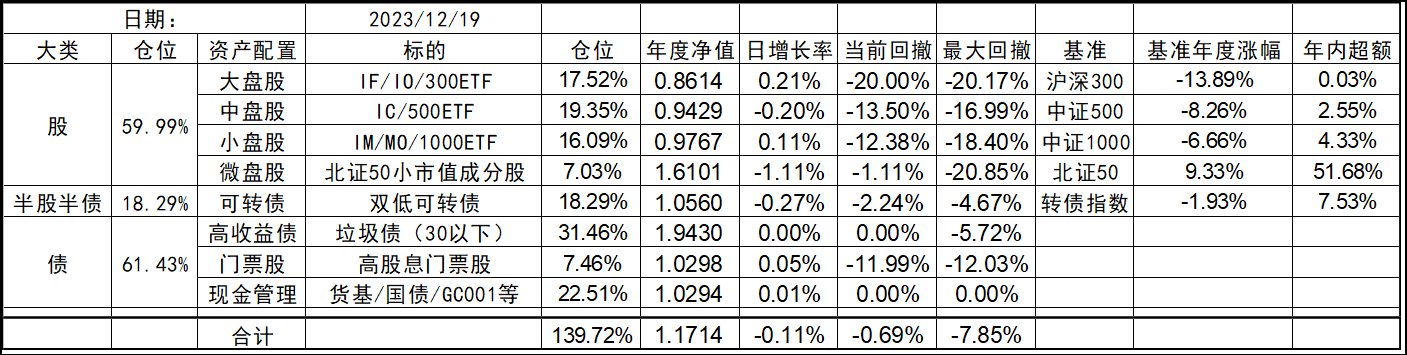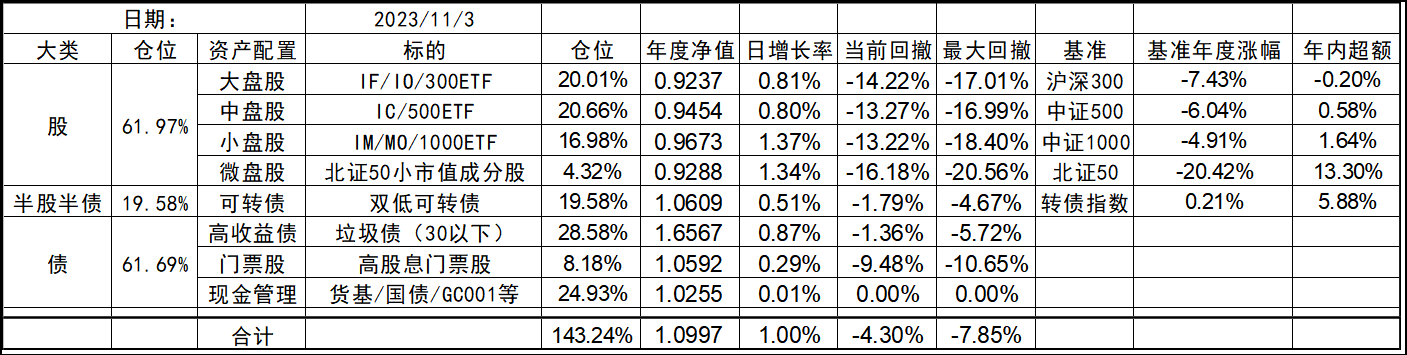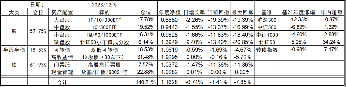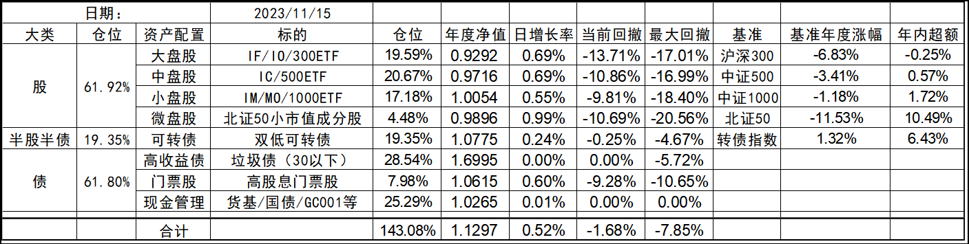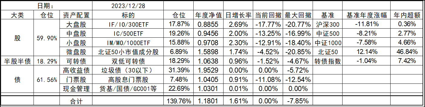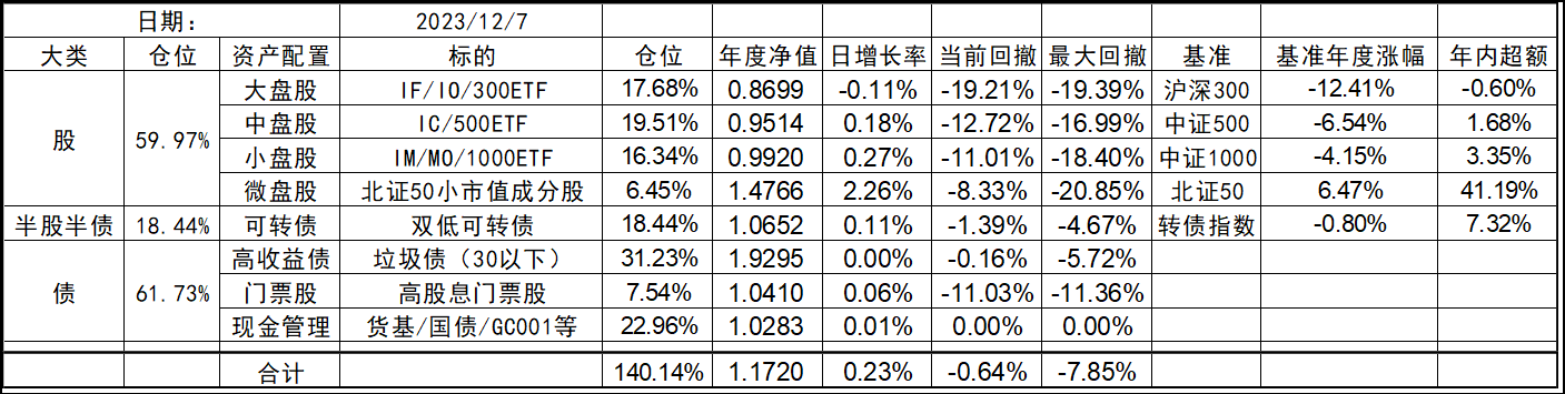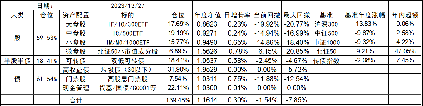 今年的持仓和去年底整体变化不大,重点只是记账方式发生了变化。指数的部分只是单纯用期指替代,然后每日记账时维持25%的保证金,同时增加了微盘股的北交所50成分股。整体依然是不择时、不深研选股的股债平衡的策略,虽在资产上重仓股票类(权益),但投研精力则放在债端的各种低风险策略上。权益类等效仓位最高不超过100%,固收类则不超过80%,杠杆率控制在130%~180%之间。