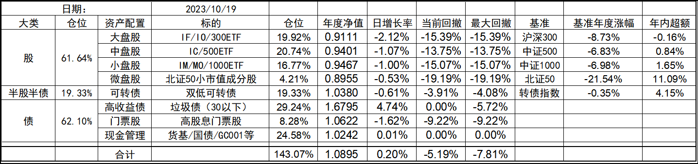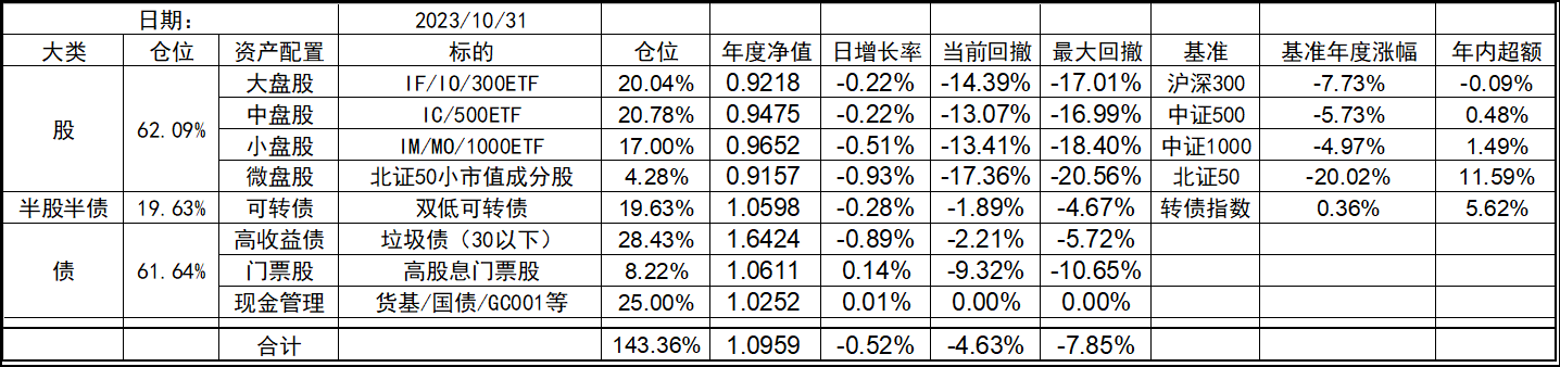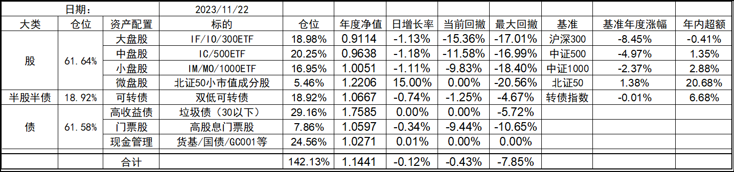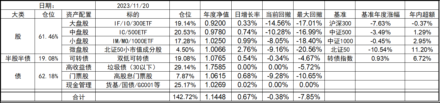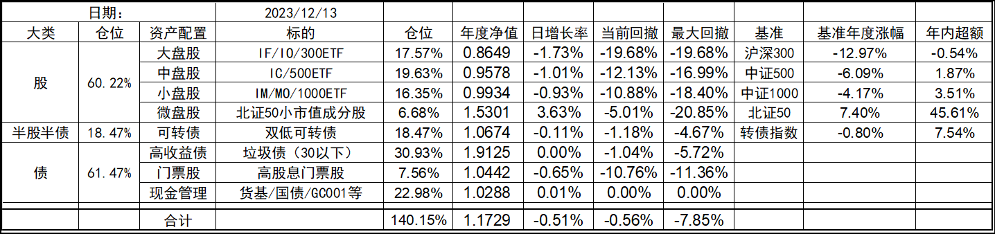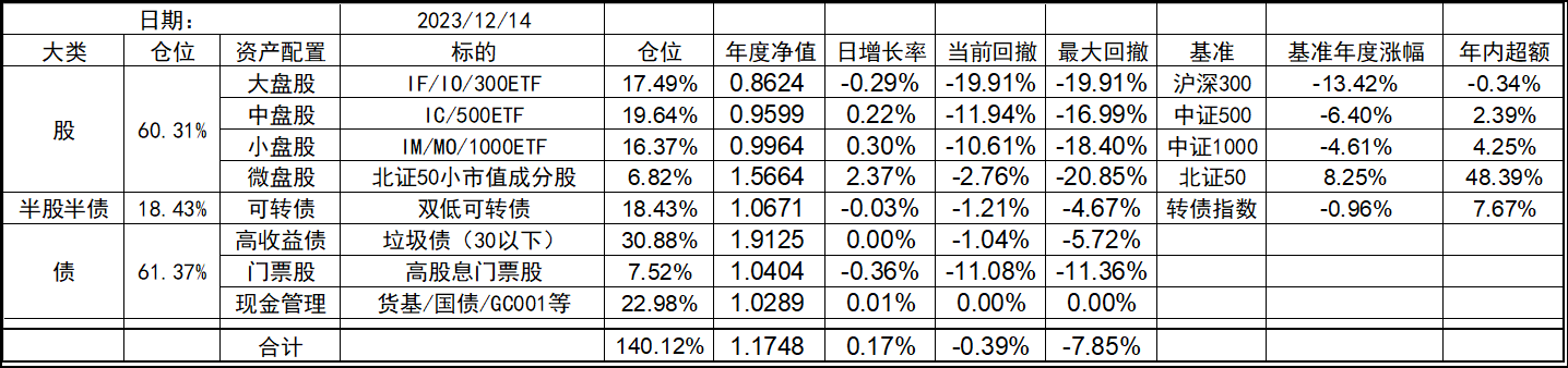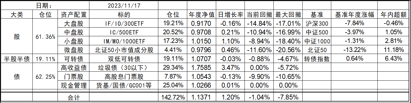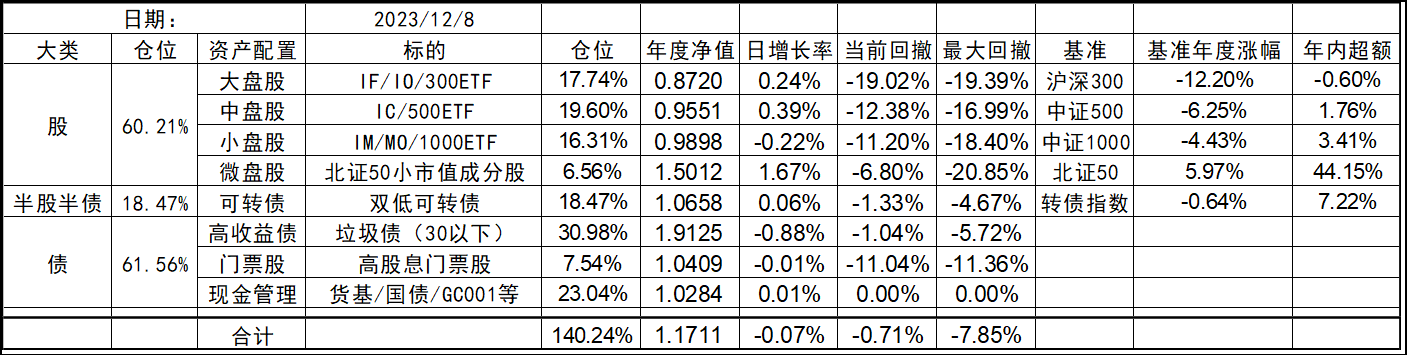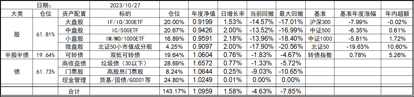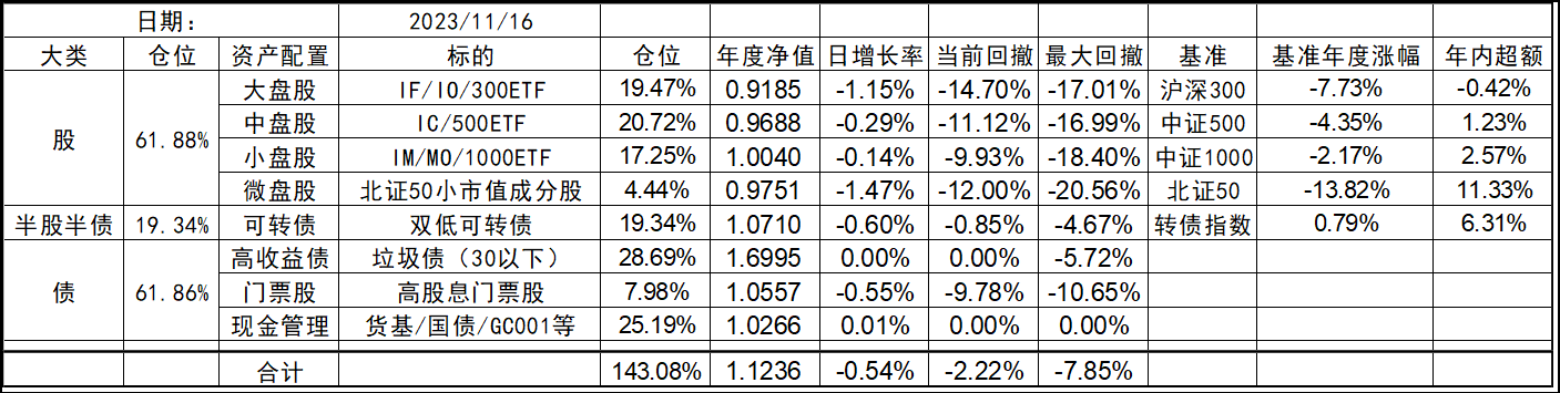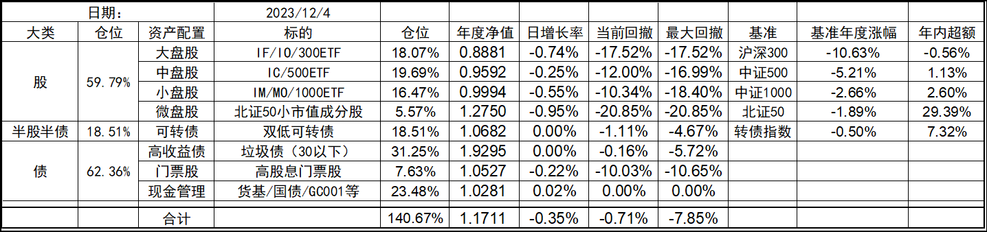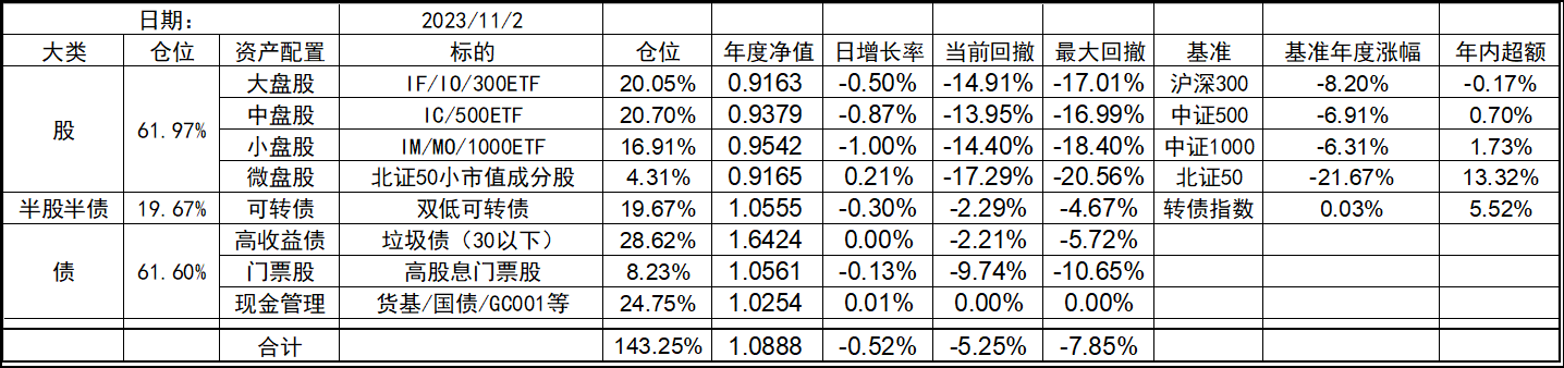 今年的持仓和去年底整体变化不大,重点只是记账方式发生了变化。指数的部分只是单纯用期指替代,然后每日记账时维持25%的保证金,同时增加了微盘股的北交所50成分股。整体依然是不择时、不深研选股的股债平衡的策略,虽在资产上重仓股票类(权益),但投研精力则放在债端的各种低风险策略上。权益类等效仓位最高不超过100%,固收类则不超过80%,杠杆率控制在130%~180%之间。