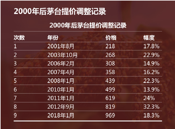 贵州茅台的提价记录如下表,从2001年至今共进行了9次提价,价格从2001年的218元提升到2018年的969元,年符合增长率9.2%。