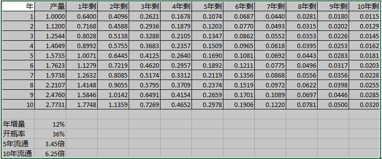 茅台的每年生产的基酒,要4年后才出厂销售。每年的年产量,大约为4年前基酒产量的80%~85%。因此,茅台的年产量是可以根据4年前的基酒产量计算出来的。