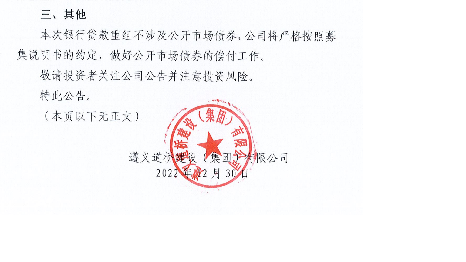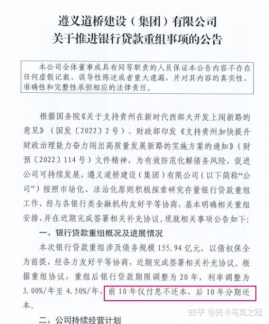 2022年12月30日,遵义最大的城投遵义道桥公告称,其155.94亿银行贷款重组方案已经出炉,展期20年且前10年不付利息。