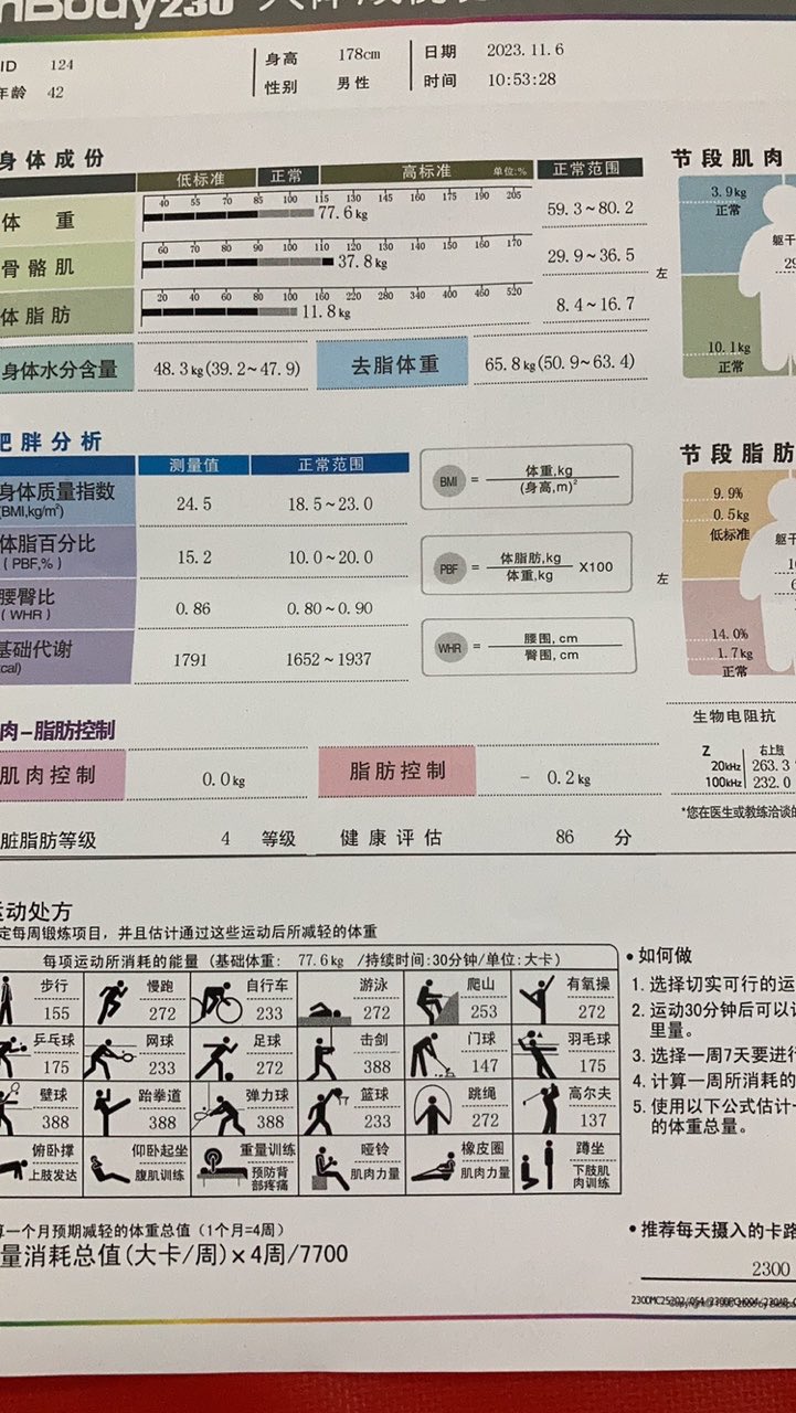 到年底,终于取得了不小的健康成果:餐后血糖控制在6以下,血压115/80左右,睡眠保持7-8小时(正常6-6个半,午睡1-1个半),起夜的情况几乎消失。就是神经系统偏弱,经常会导致血压波动;经过第二个减脂期,体重从2月初的82.3降低到77.6公斤,并依靠增肌维持住了热量缺口,过了年再减脂一个阶段就可以达到75.5的长期目标。