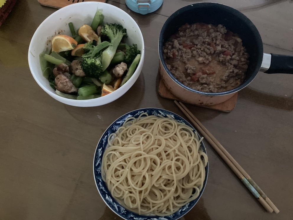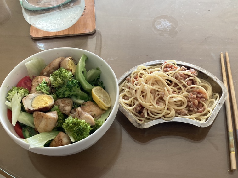 8点把娃送完照例在河边晒太阳(促进补充维D合成)晨练一小时,回来测血压正常。玩会儿王国之泪开始做饭。中午的食材,基本雷打不动的几样,蔬菜补充维C,意面算是慢碳,200克鸡肉补充蛋白质,一顿午饭大概800-900卡,加上早晚饭,2000卡出头是有的,减脂是不能饿肚子的。