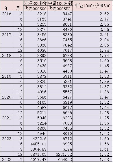 好贴。小猪老师,去年看了你的贴水视频直播,当时就想学您吃IM的贴水了。后来我做了一个中证1000/沪深300历史比价对照表(见附表),想在这个比价降到1.5左右时,再把IH全部换到IM。但等了几个月,这个1.5一直没有等到。