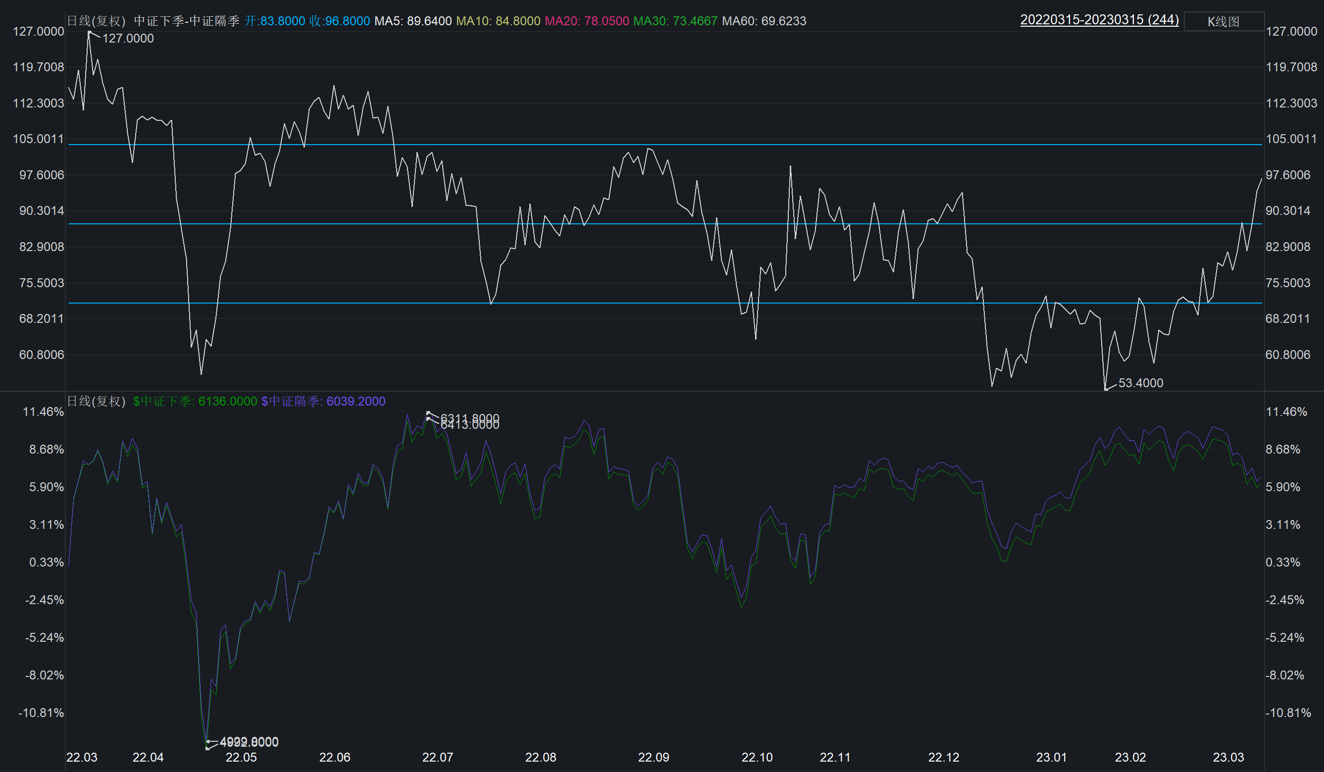 23年的时候,和帖子中说的情况完全相反了。年中的时候贴水最小,这个时候隔季贴水也就只有六七十个点,到23年底和24年初的时候,贴水大幅升高。这个时候换月贴水就有一百多个点。