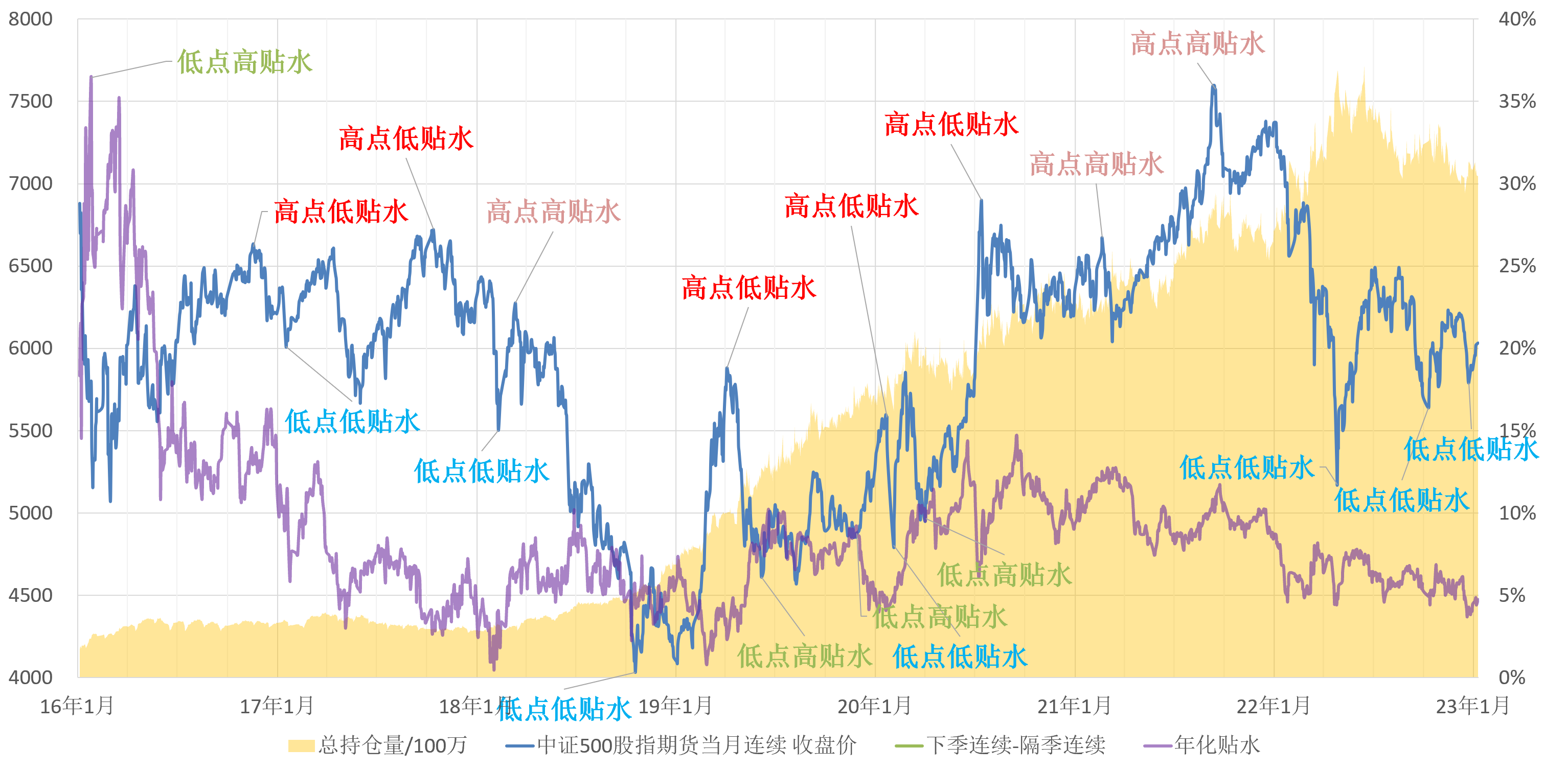 这是股指期货IC从2016年1月1日-2023年1月9日的点位、贴水、持仓量走势。