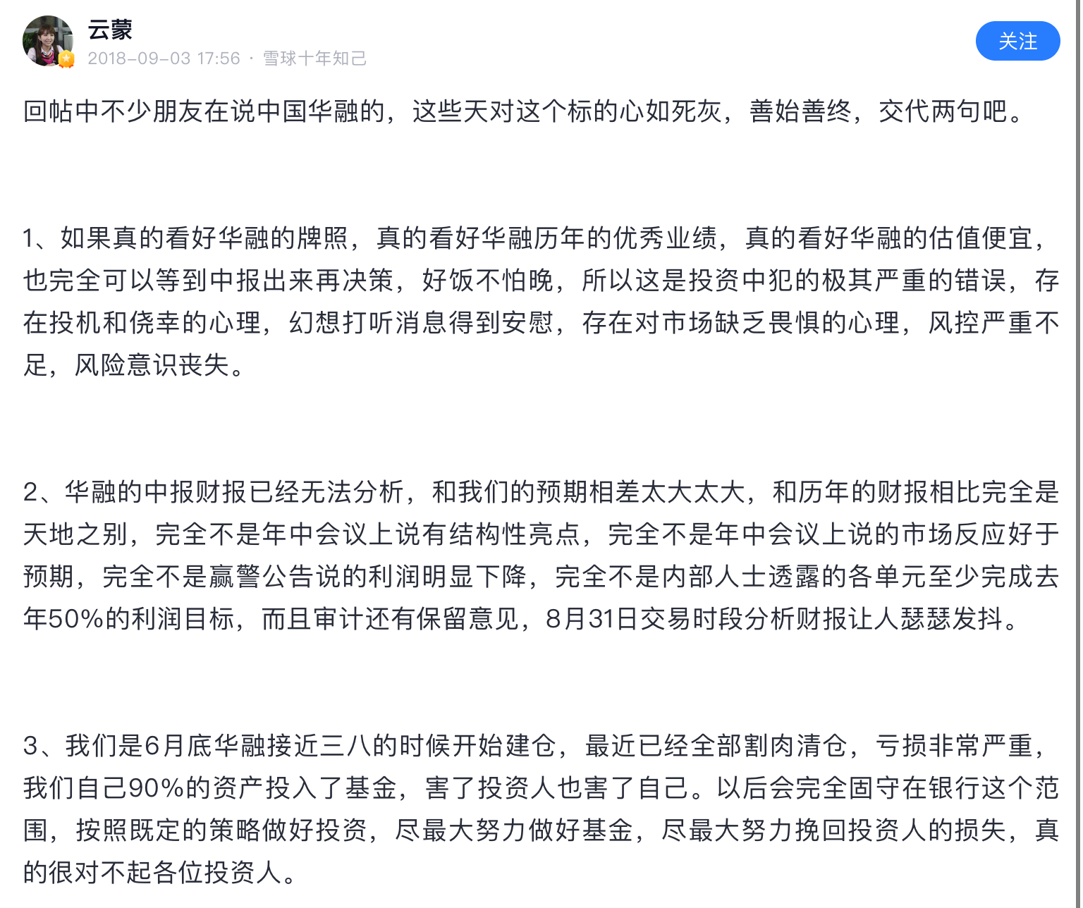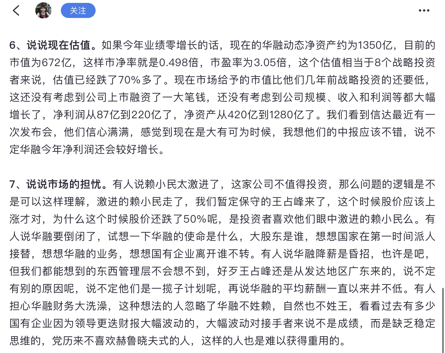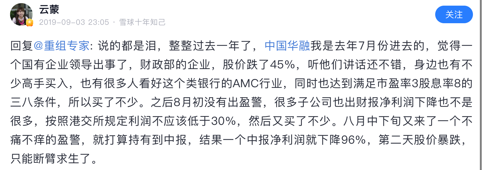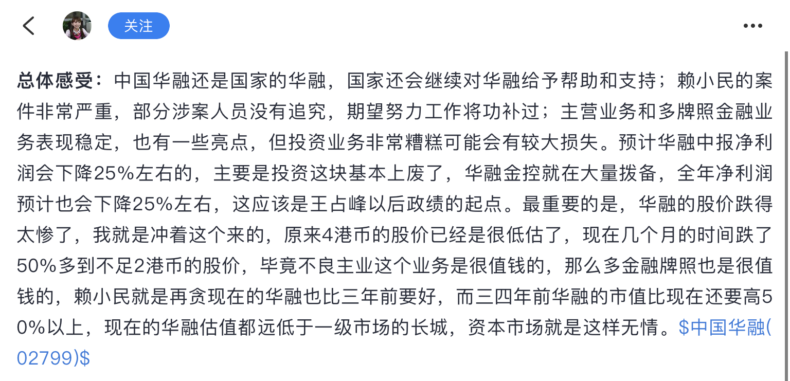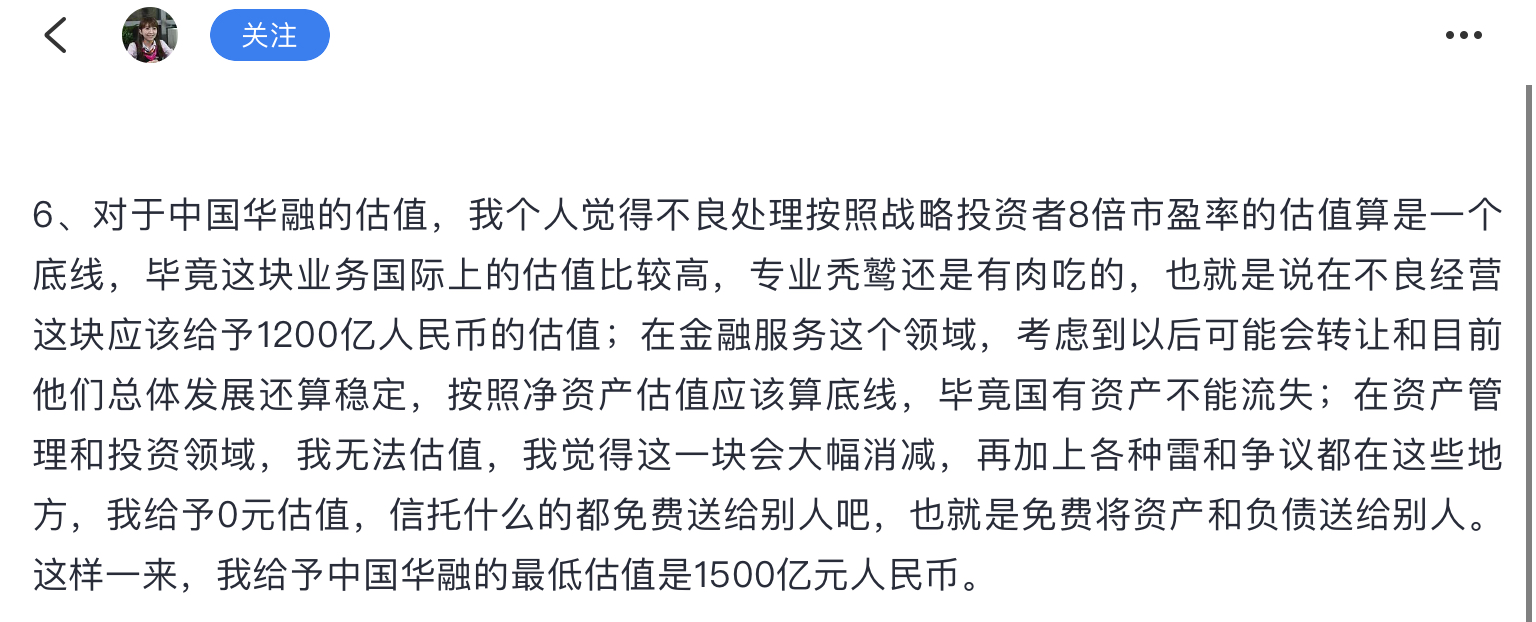 她/他认为华融应该值1500亿,后来增资了420亿,市值仍只有150亿,和预期差个0。不过她/他没等这么久,割的还算及时,但造成了巨大损失