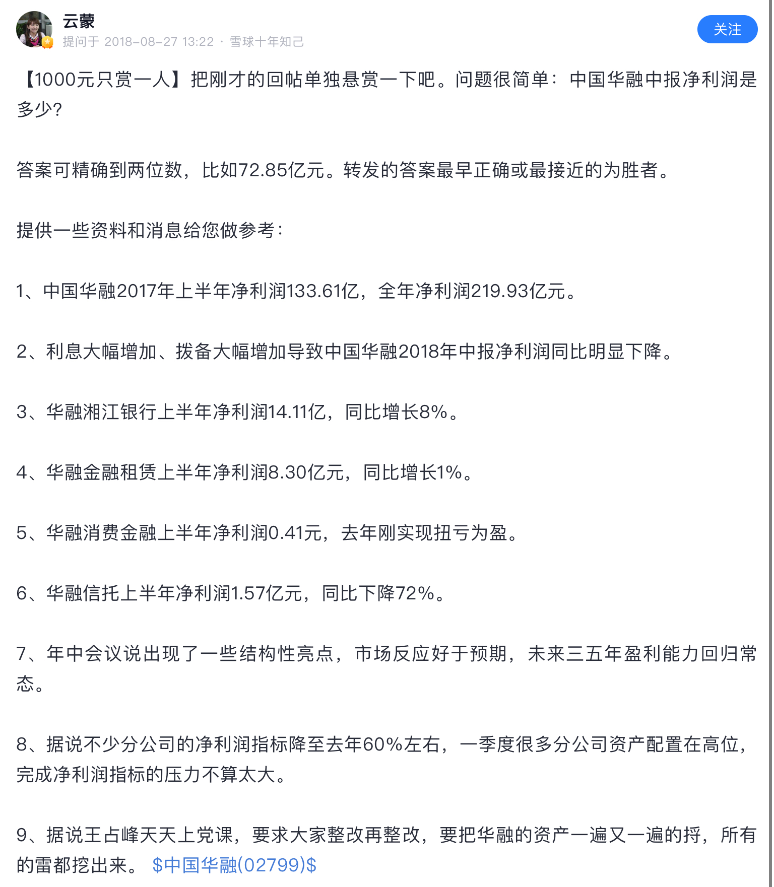 华融中报前,她/他发起过竞猜业绩,并认为虽然赖某某被抓了,但业绩从17年的半年的130多亿,也就掉到100亿,结果是勉强财技的两亿