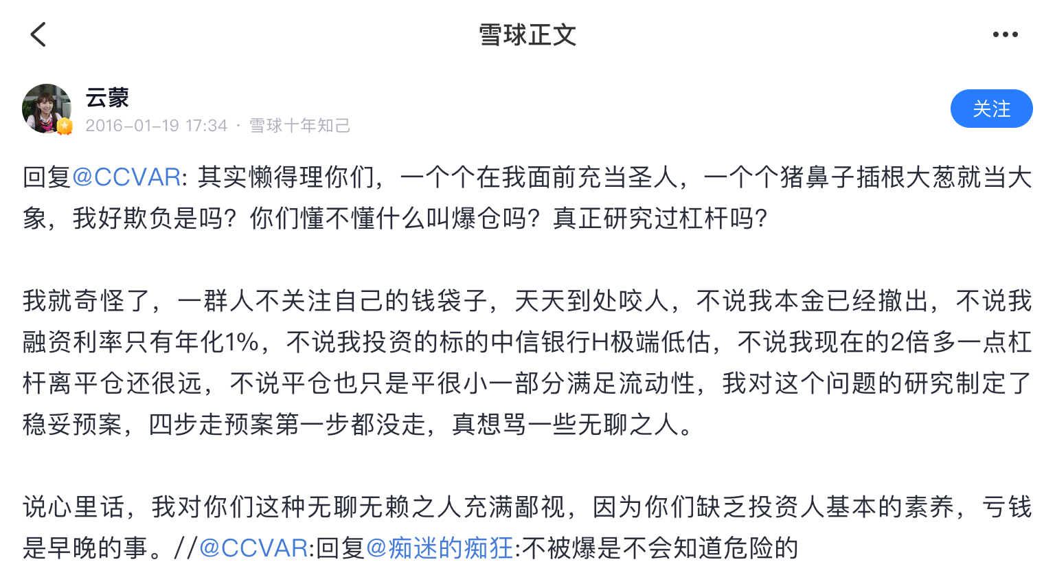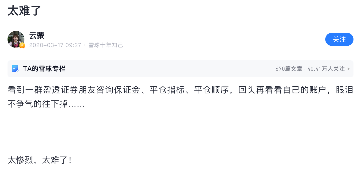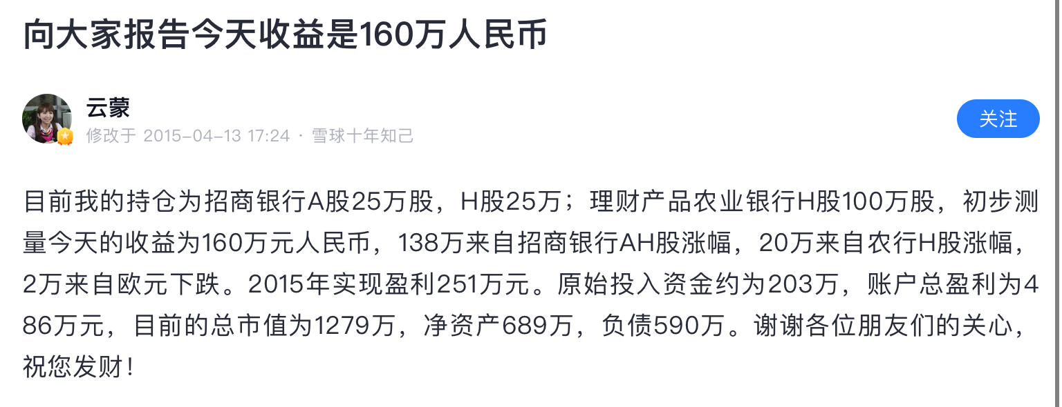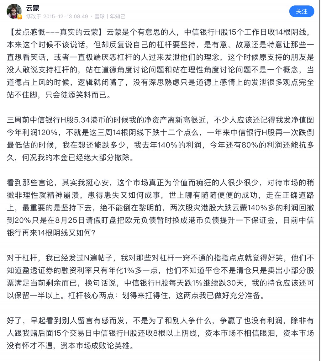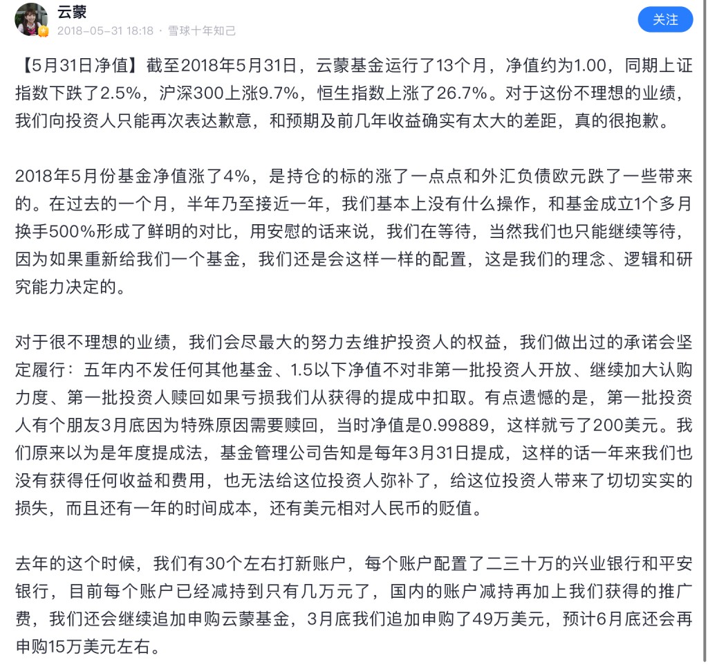 雪球就是骗子窝,在雪球上扯淡做成大v的然后发私募的有几个成功了,1%都没有。这个云蒙更是骗中骗,15年之前顶着个美女头像骗一群炒股的抠脚大汉,死宅男们,那时云蒙就是个傻白甜形象,北京哪个银行工作,家里有点儿钱,给北京买房安家了。然后自己啥也不懂,误打误撞买了招商银行,然后被套了不断补仓!那时大家都当云蒙是个傻白甜,谁都能说她几句,散户给她留言她都回的!15年后形象大变,其实按照正常的融资融券和招...