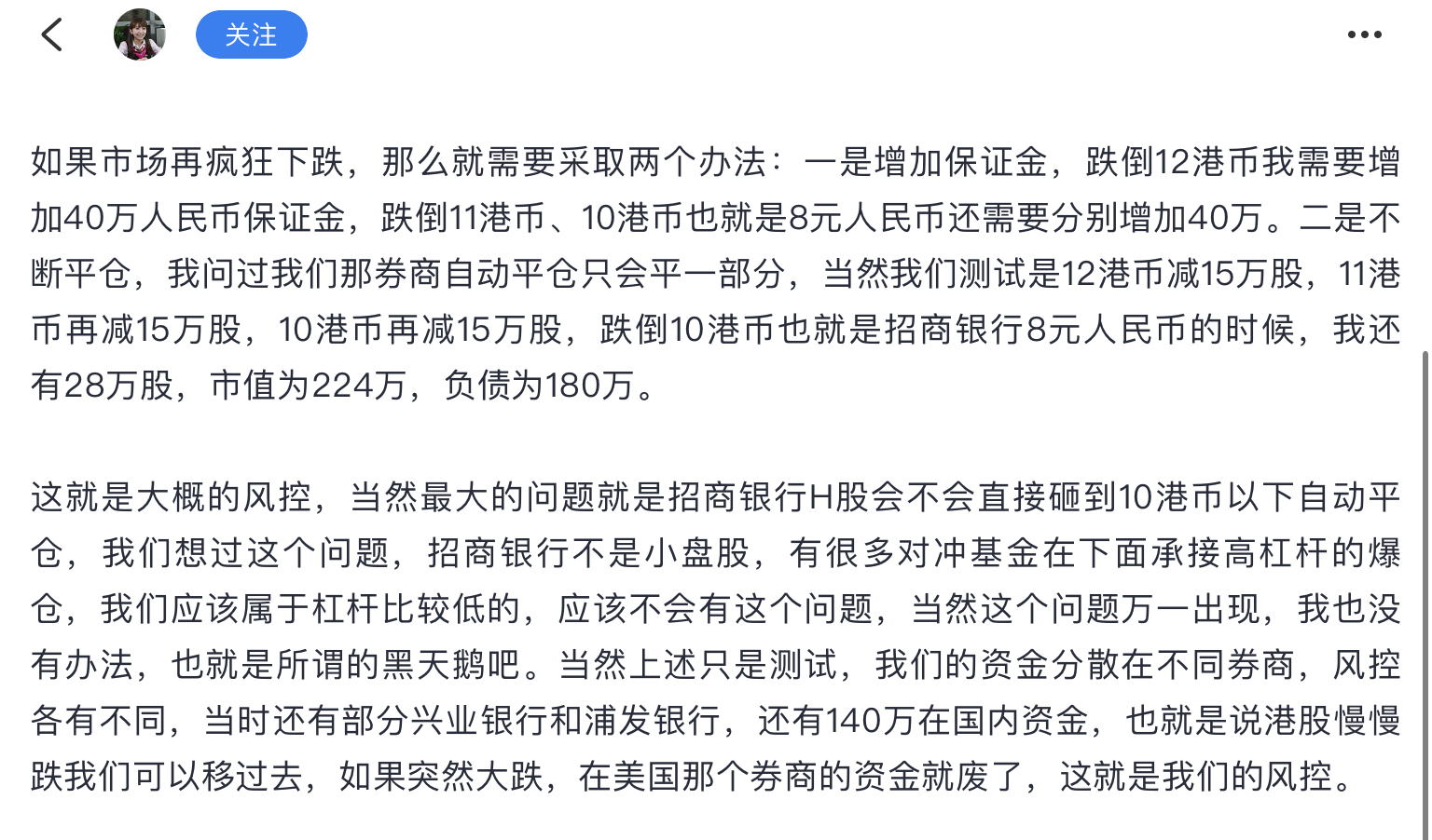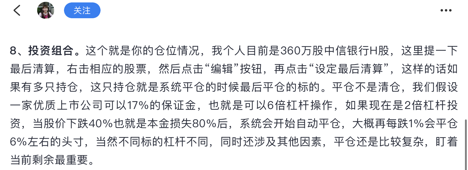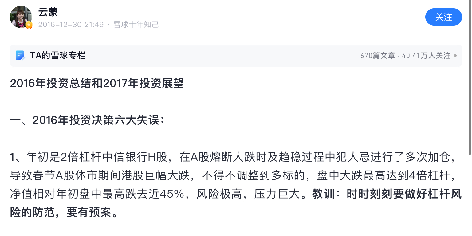 这里总结了16年最高4倍杠杆硬抗中信H下跌。当时她/他说如果再跌就继续家里有矿模式从内地筹钱,但是顶过去了,所以六大失误是为了之后凡尔赛铺垫,自己没把总结当回事。