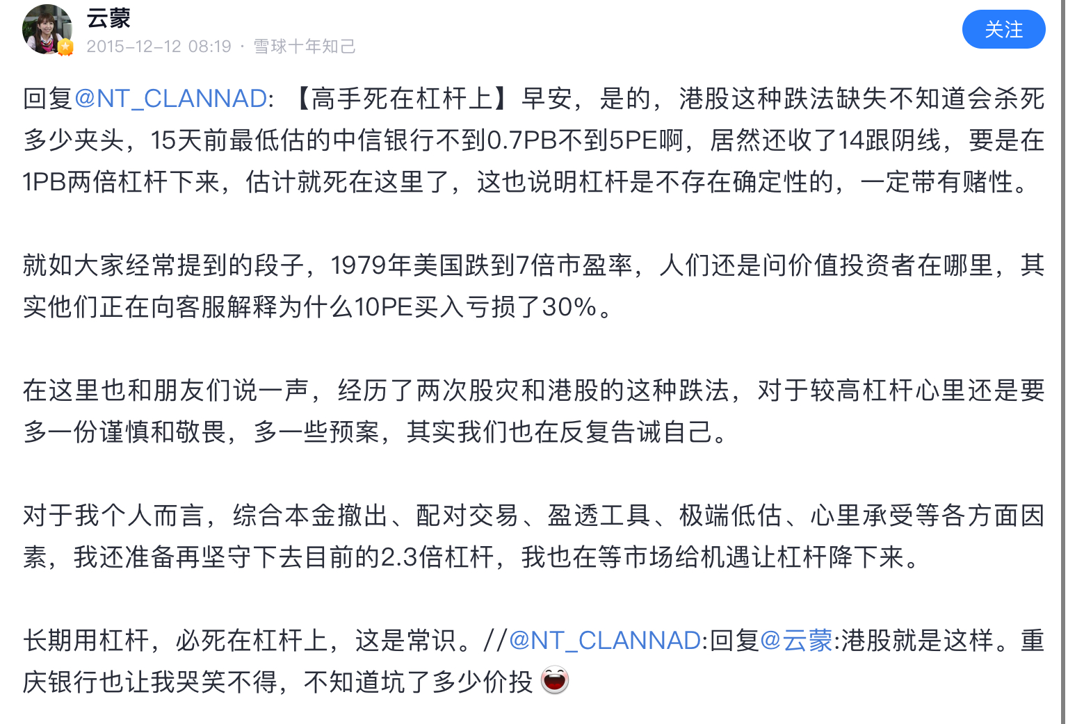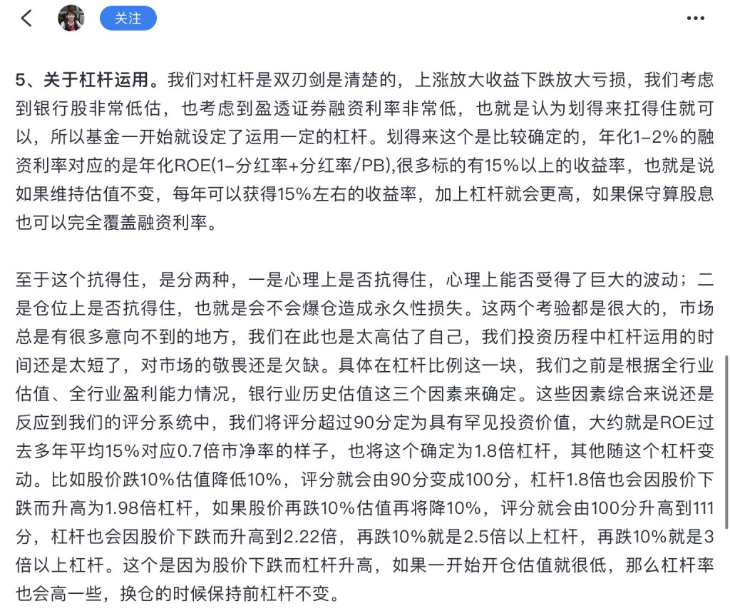 杠杆只是工具,没有好坏之分,只有会用和不会用之分。我是用自己的钱来投资的,加杠杆是为了拓展资金空间,用来执行价投交易策略。那两位加杠杆是用来赌博的,他们没有仓位管理计划,我们之间没有可比性。但凡有点真才实学,谁还愿意为别人打工(代客理财)。