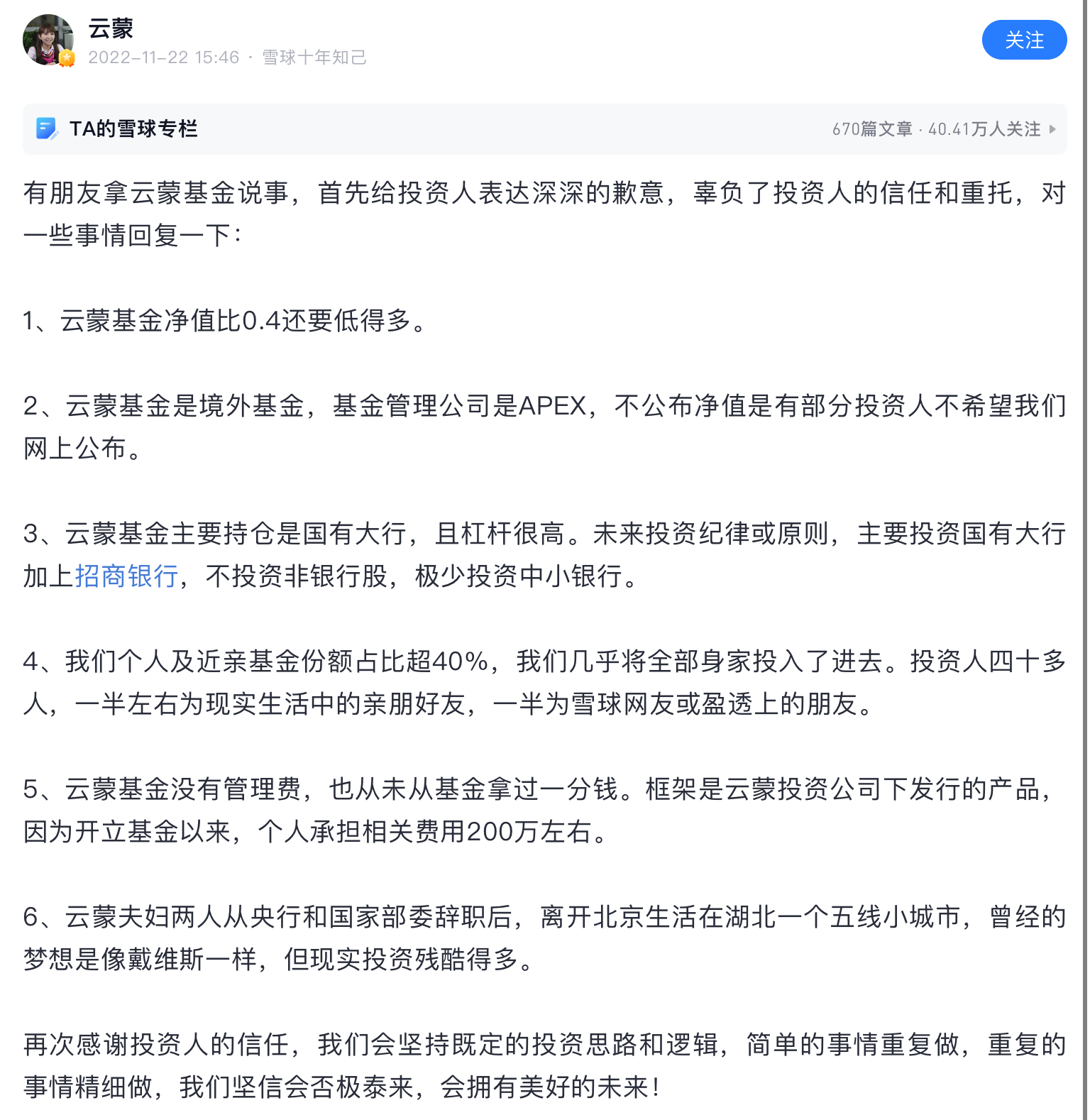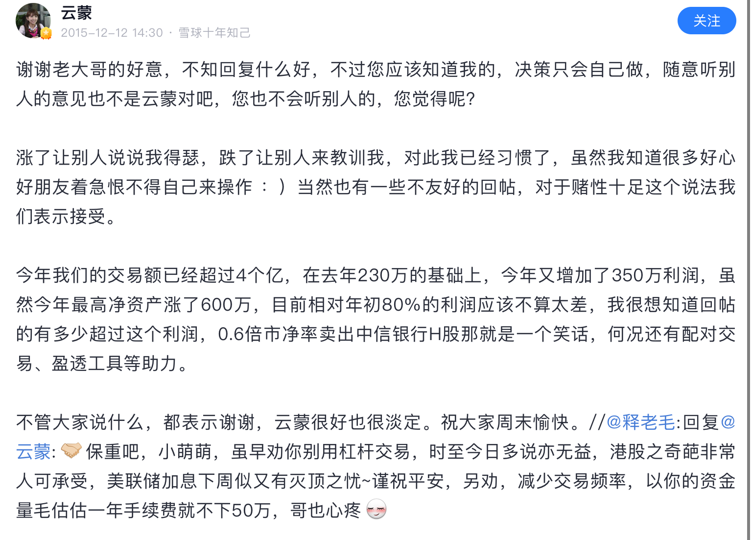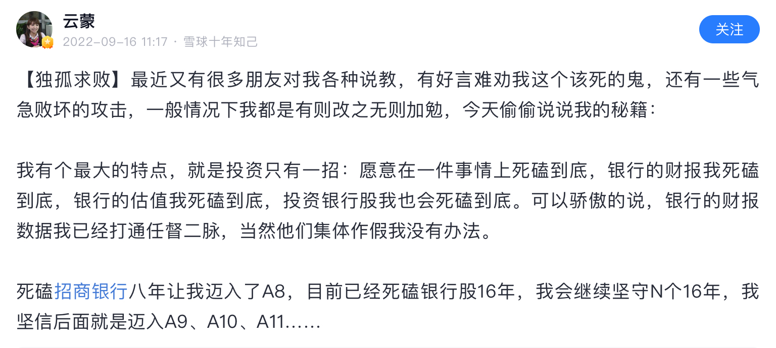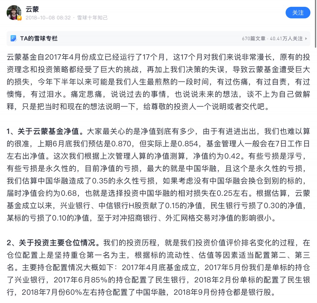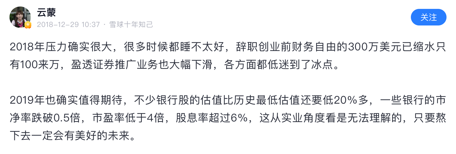 雪球就是骗子窝,在雪球上扯淡做成大v的然后发私募的有几个成功了,1%都没有。这个云蒙更是骗中骗,15年之前顶着个美女头像骗一群炒股的抠脚大汉,死宅男们,那时云蒙就是个傻白甜形象,北京哪个银行工作,家里有点儿钱,给北京买房安家了。然后自己啥也不懂,误打误撞买了招商银行,然后被套了不断补仓!那时大家都当云蒙是个傻白甜,谁都能说她几句,散户给她留言她都回的!15年后形象大变,其实按照正常的融资融券和招行涨幅,她应该赚不了她所说的那些钱!然后神马盈透之类的出来了,网格交易之类的真实面目出来了!而这些15年以前她从来不说的!之后更是以银行大v身份自居,每年拿个坏账率,利润增速之类的东西做几个表格就自动感动成银行大v了!更重要的是此人后来投机性极大,被套了想翻身重仓民生,重庆农商行甚至华融等,买一个一个爆雷,最后万劫不复!如此人物竟然是雪球大v,悲唉啊