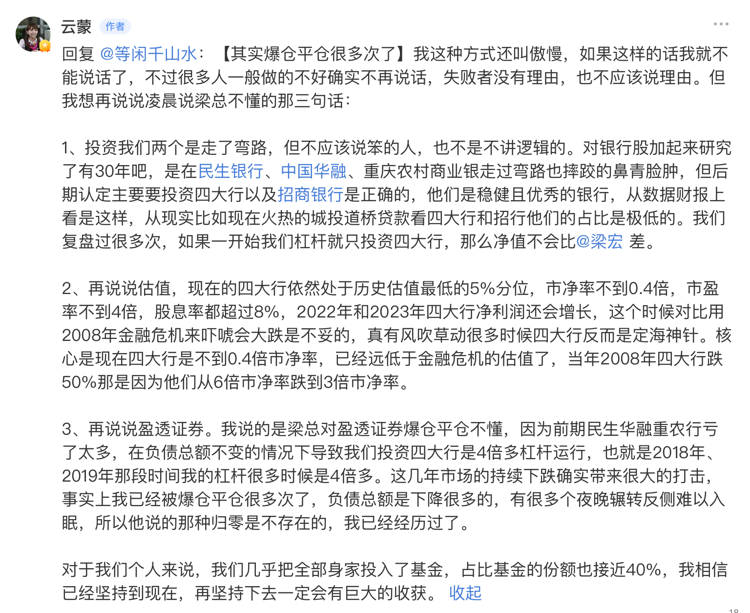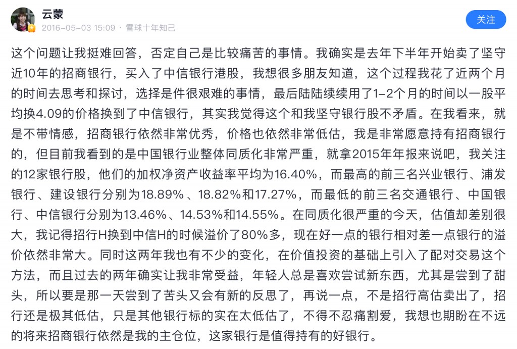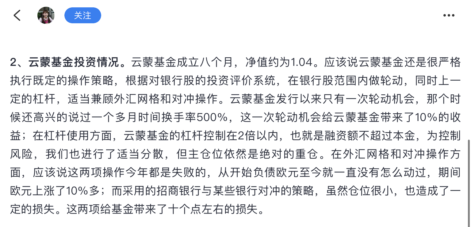 有些人要与云蒙比银行业的专业知识,哪来的自信?省高考状元都不一定能考上五道口金融学院的硕士研究生,再说她也有央行工作经验,搞私募时对银行业肯定做过大量研究。云蒙敢加杠杆买建行H股,说明在她眼里那些不良、银行的杠杆率不是啥大事。我选择相信云蒙对银行业基本面的判断,但不认可她买银行股的时机和杠杆操作。最近一个多月,我买建行H股盈利10个点了,她的私募净值是0.2,但我承认她的银行专业知识远在我之上,这...