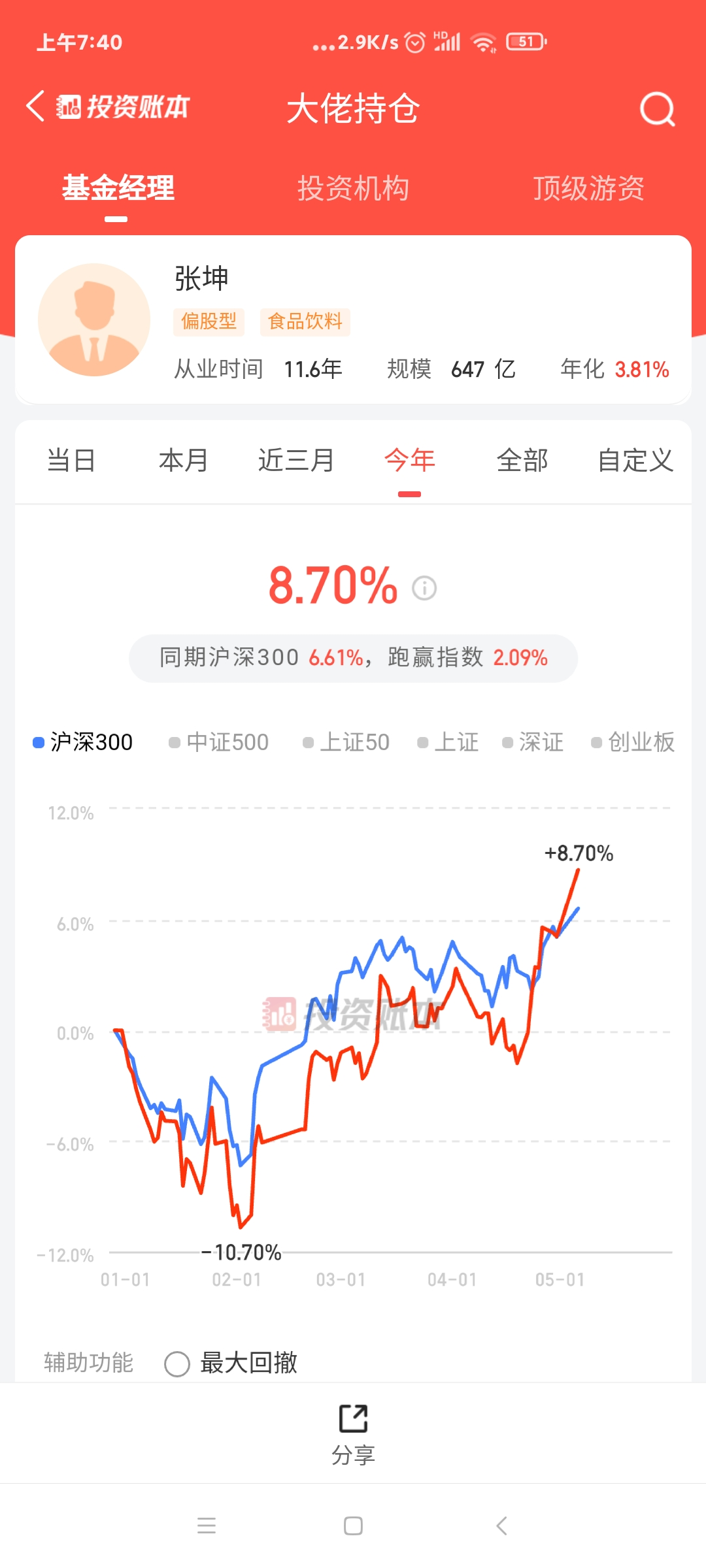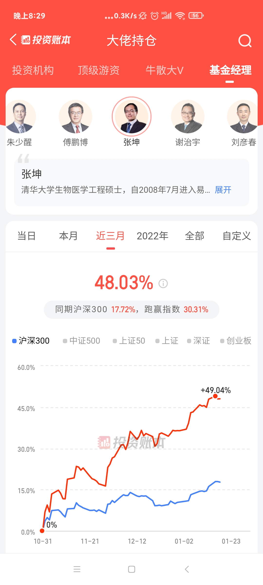 上半年张坤的基金是弱于沪深300的,但从去年11月1日算,还是仍强于沪深300的,白酒调的比较多