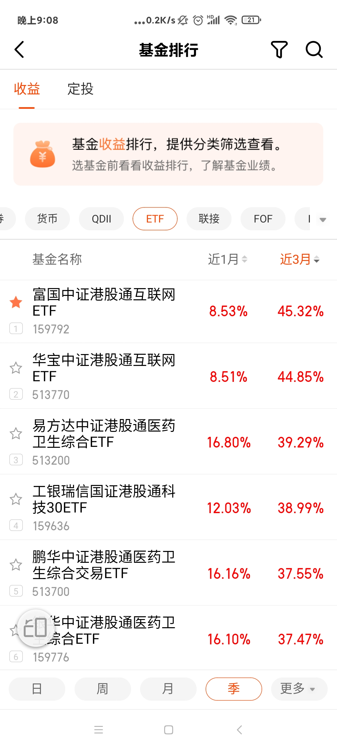 看了下一季度比较关注的基金走得好的不多,张坤一季度1.8%,在换手少的情况下还不错,腾讯港交所美团加白酒,这个组合我喜欢。基金回调不可怕,可怕的是下来上不去,还有业绩一拉下就频频换手的,疷部韭菜少,疷部换手频频的本身就会成韭菜,当然牛市换手频频很正常。
