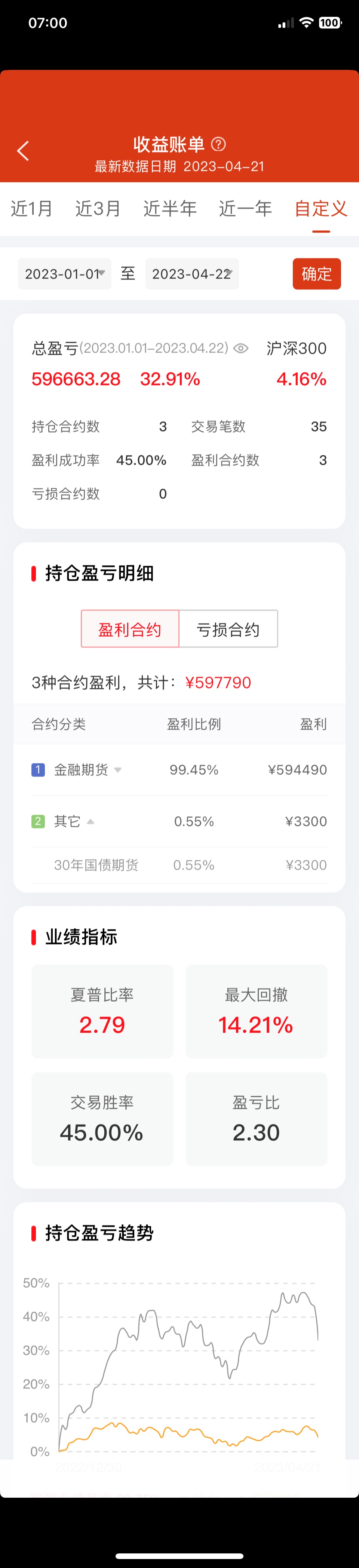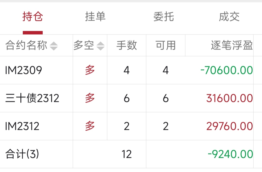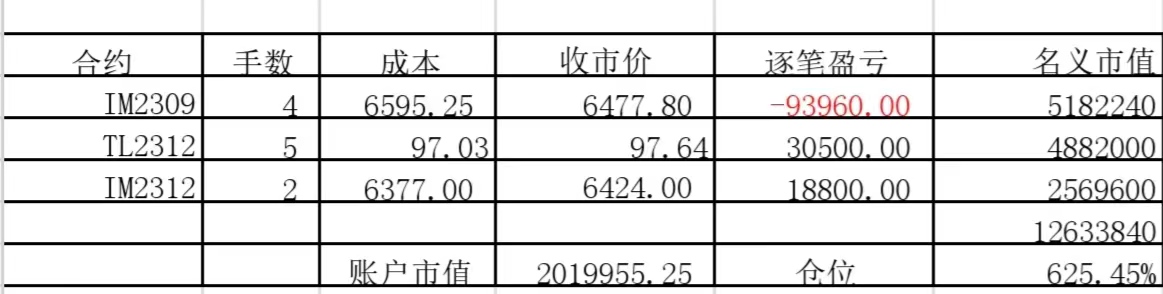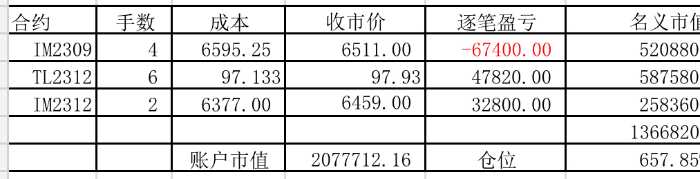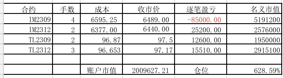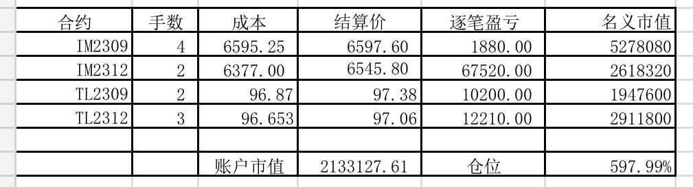 本周增加了点国债期货,周五三十年国债出来后,又换成三十年国债期货。期货波动真大,一周就没了13.8%!周收益 年收益 仓位 重仓一 重仓二 重仓三 -13.80% 32.91% 496% IM2309 TL2306 IM2306三十年国债期货的"贴水”貌似并没有比十债有多大优势,但是其波动却远大于十债。当然的利率处于较低水平,是否三十债的风险较大?仅是我浅薄之见,不知楼主如何思考的?